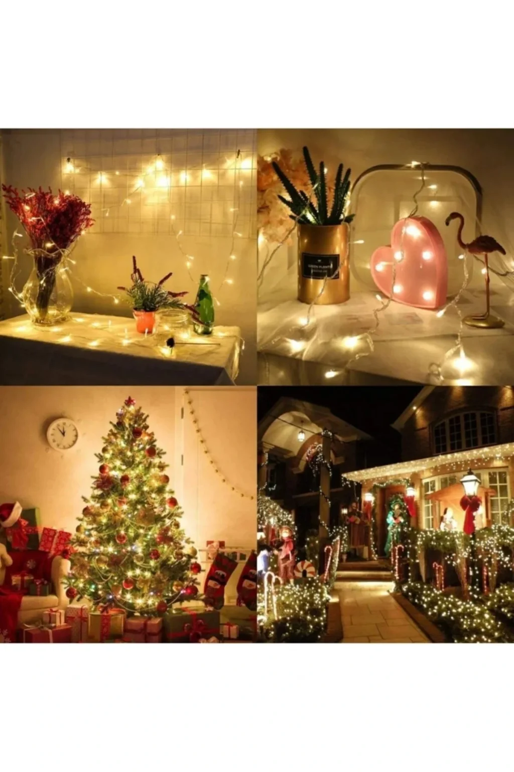 100 Ledli 8 Fonksiyonlu 10 Metre Uzunluğunda Dekor Lambası Yılbaşı Dekorasyonu, ortam süslemesi, kutlama ve ağaç süslemesi yaparken dekoratif yeni yıl ışıklarını kullanabilirsiniz. ; Mekanınızı aydınlatırken bir yandan da dekoratif görünüm kazandıracaktır. ; Led Işık ( Daha keskin ve parlak Işık yayar ) Şeffaf kablolu Led Renkleri :Gün Işığı (Sarı) Türk Prizine Uyumludur. ; Giriş : 220V Güç : 55W Kumanda edilebilir 8 fonksiyonludur. ; ( Bir tuşla, sabit yanar, yavaşça sönerek, hızlı yanıp sönerek, biri yanarken diğeri sönerek gibi kombinasyonları;