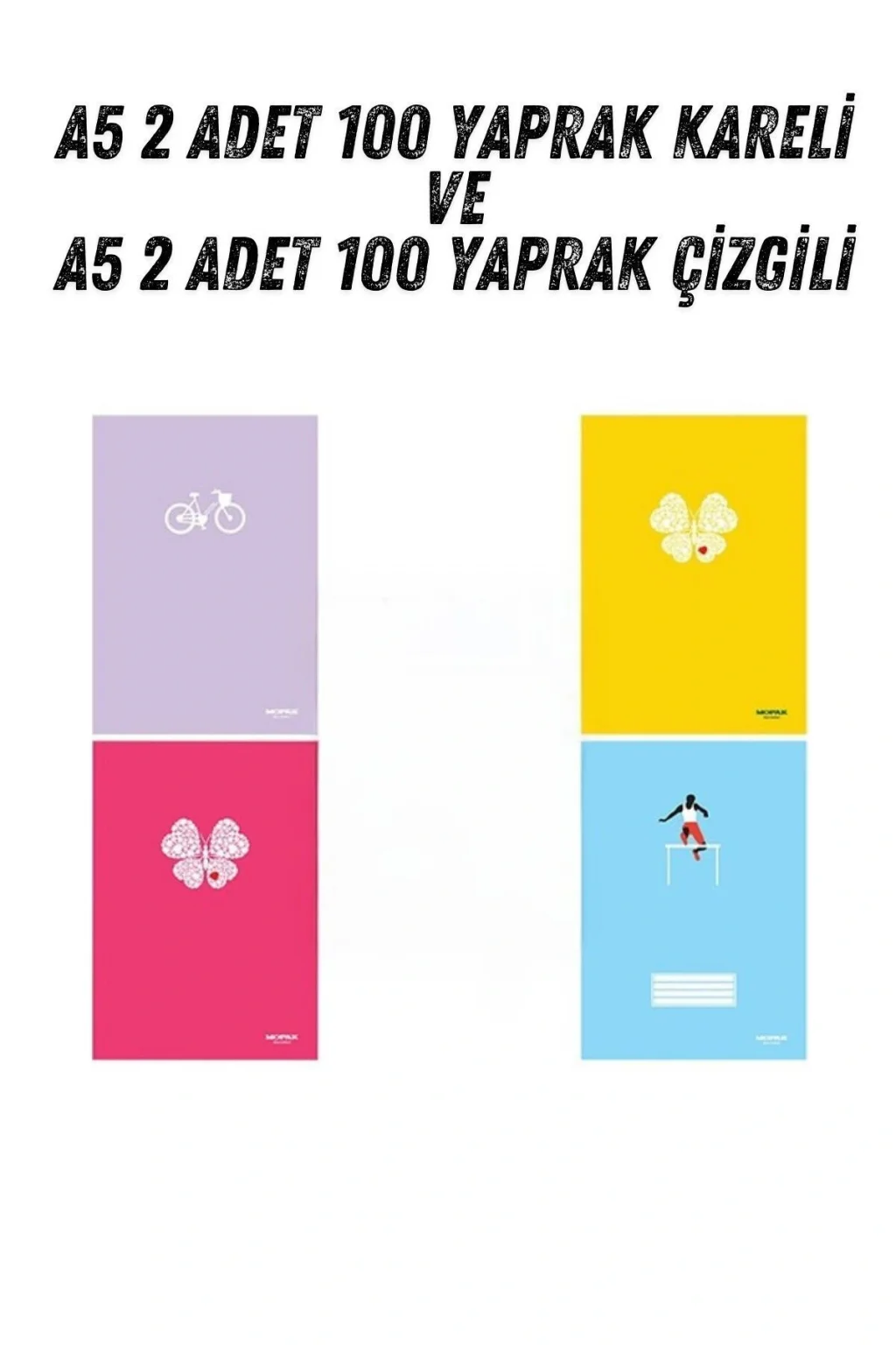 100 Yaprak Kareli Ve Çizgili A5 Küçük Boy Okul Defteri 4 Adet