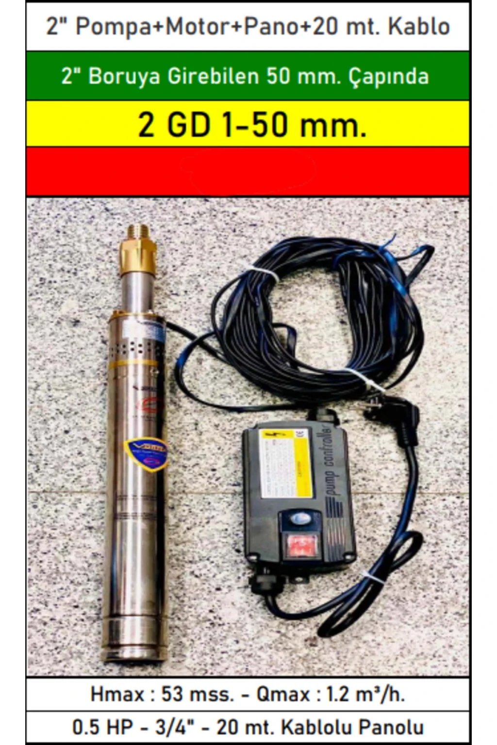 1; 50 mm dış çaplı 2" boruya girebilen tasarımı sayesinde geniş bir kullanım alanı sağlar ve çeşitli sulama ihtiyaçlarına uygunluk gösterir; Kablolu panolu yapısı ile kolay kurulum imkanı sunar ve sabit bir çalışma alanı oluşturarak verimli su akışı sağlar;