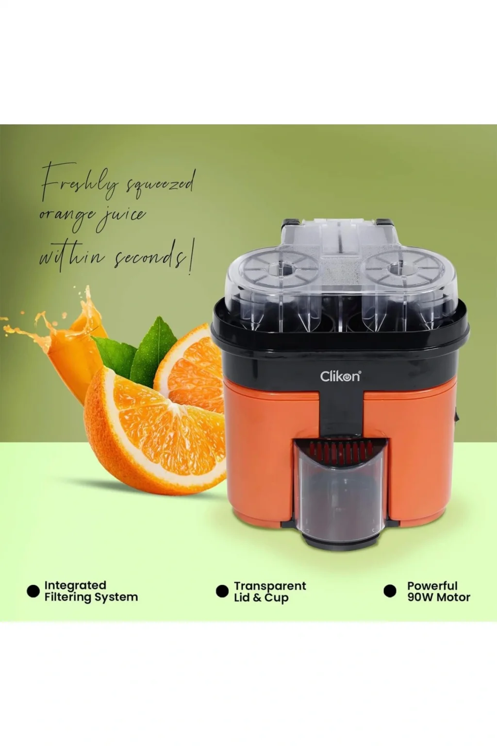 CLIKON markasına ait bu 2'si 1 Arada Narenciye Sıkacağı, mutfaktaki en pratik yardımcınız olmaya aday! Çift sıkacak teknolojisi ile tek dokunuşla kullanarak 60 saniyede 6 portakal sıkabilir, taze ve lezzetli meyve sularının tadını çıkarabilirsiniz.; Dahili narenciye dilimleyici özelliği sayesinde meyveleri dilimleyip sıkmak için tek bir işlem yapmanız yeterli.; 90 Watt gücüyle etkili bir performans sunan bu sıkacak, çıkarılabilir parçaları sayesinde kolay temizlik imkanı da tanır.; Şık turuncu ve siyah rengiyle mutfaklarınıza modern bir dokunuş katacak!