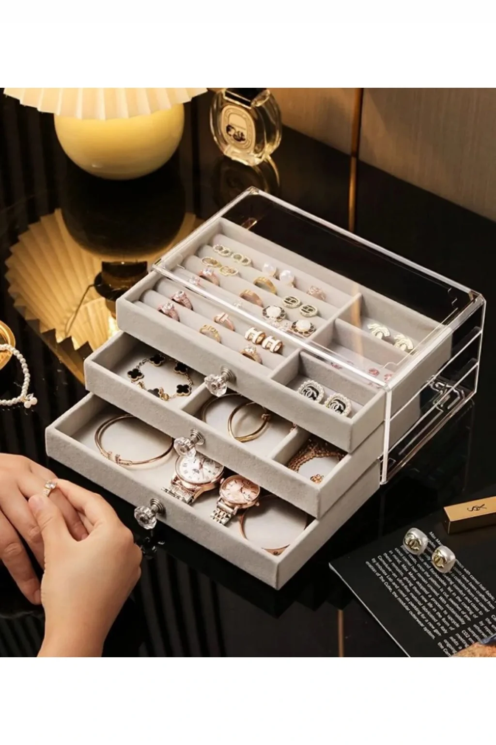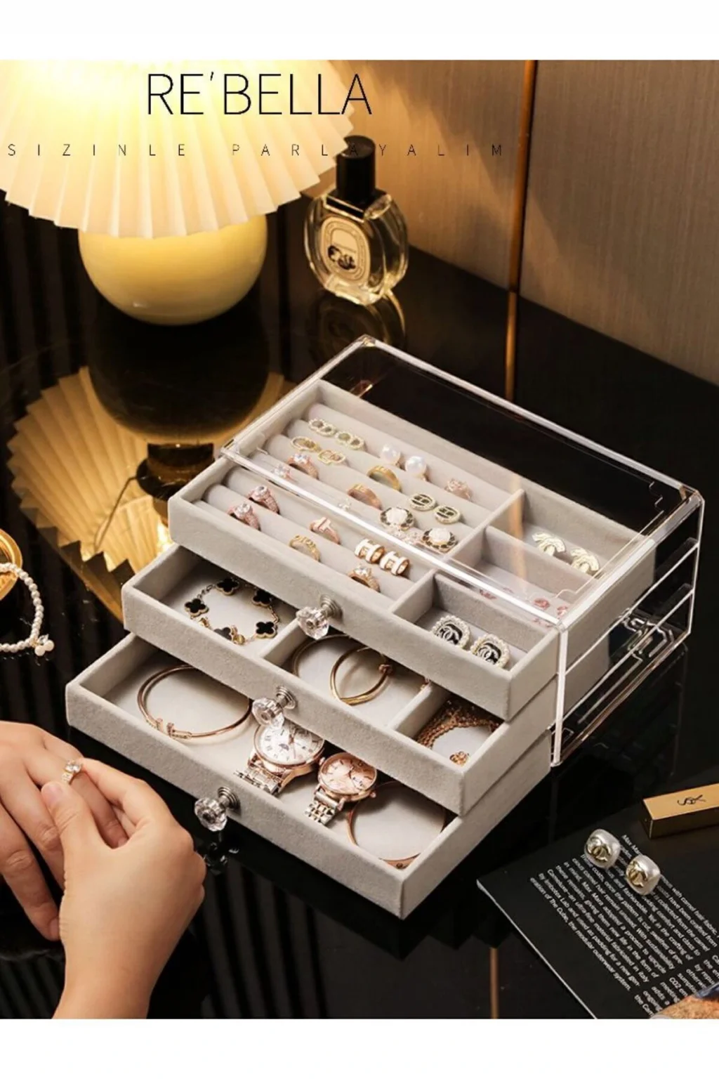 3 Çekmeceli Bölmeli Şeffaf Takı Kutusu ; 3 Çekmeceli Bölmeli Şeffaf Takı Kutusu sayesinde artık takılarınız daha düzenli.; ; Aradığınız takıya artık tek bakışta ulaşabilirsiniz.; ; Küpelerinizi, yüzüklerinizi, kolyelerinizi, bileziklerinizi ve daha fazlasını farklı çekmecelere yerleştirebilirsiniz.; ; Ürünümüz sert plastikten yapılmış olup iç kaplaması kaliteli kumaşla kaplanmıştır.; ; Böylece takılarınızı temiz bir şekilde muhafaza edebilirsiniz.; ; Mücevherleriniz artık çizilmeyecek.; ; Bej ve Gri renk seçenekleri ile zevkinize hitap etmeye hazır.; ; Ürün ölçü bilgileri ; Boy: 13 cm.; ; En: 23 cm.; ; Derinlik: 10 cm ; Zarif ve ince tasarımı ile odanıza şıklık katacak.; ; Re' Bella.;