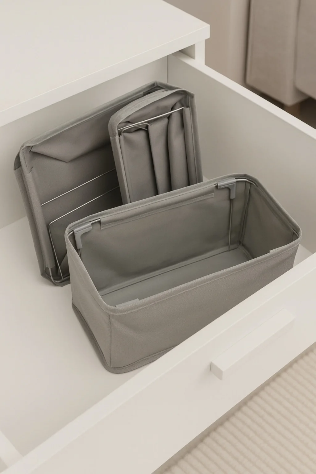 - Üç adet katlanabilir kıyafet düzenleyici, dolabınızdaki dağınıklığı kolayca toparlamanızı sağlar.; - Kolay temizlenebilen yüzeyleri sayesinde pratik kullanım sunar; silerek hijyenini koruyabilirsiniz.; - Dayanıklı tela materyali ile uzun süreli saklama ihtiyaçlarınızda yanınızda olur.; - Yerden tasarruf sağlayan boyutları (45x20 cm) sayesinde küçük alanlarda bile etkili depolama imkanı tanır.; - Türkiye'de üretilmiş olması yerel üretim avantajlarını beraberinde getirirken kalite standartlarına uygunluğunu garanti eder.