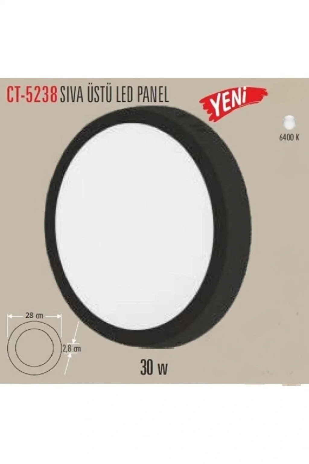 CT-5238 30 WATT SIVA ÜSTÜ LED PANEL SİYAH KASA; ; Işık Gücü: 30 Watt Beyaz: 6400 K (BEYAZ IŞIK) 1700 lm; ; SMD led Ürünün ölçüsü: 28 cm - 2,8cm ;