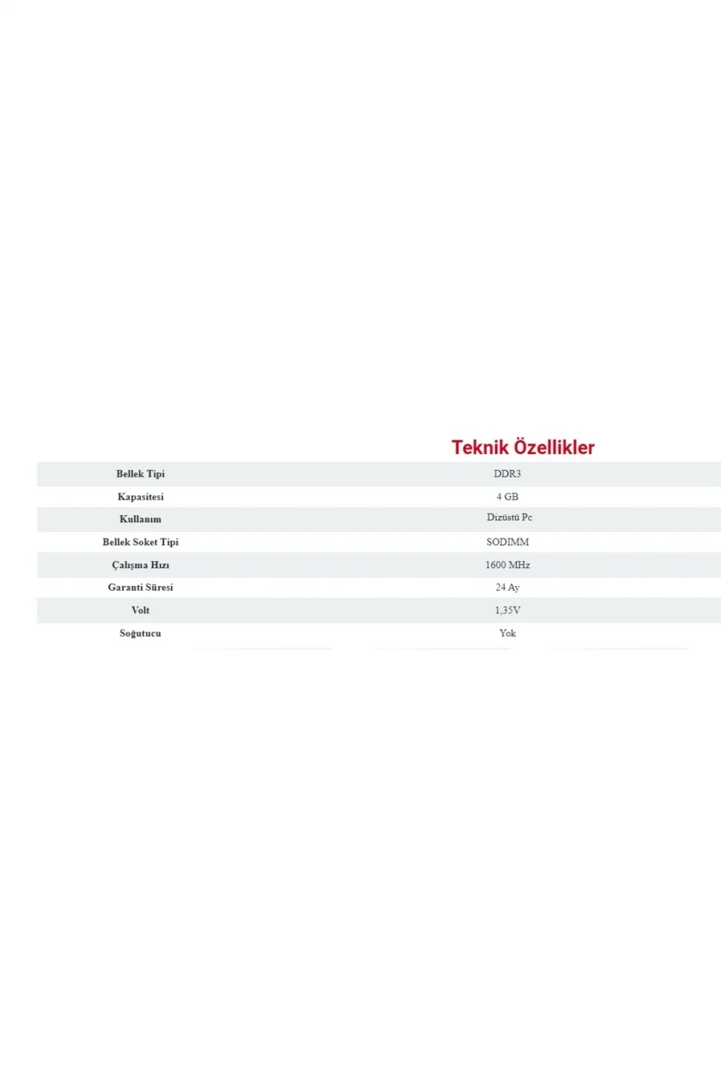 Teknik Özellikler Uyumlu Sistem Notebook Kapasitesi 4GB Bellek Tipi Notebook DDR3 Çalışma Hızı 1600 MHz Soğutma Yok Kit Tek Modül