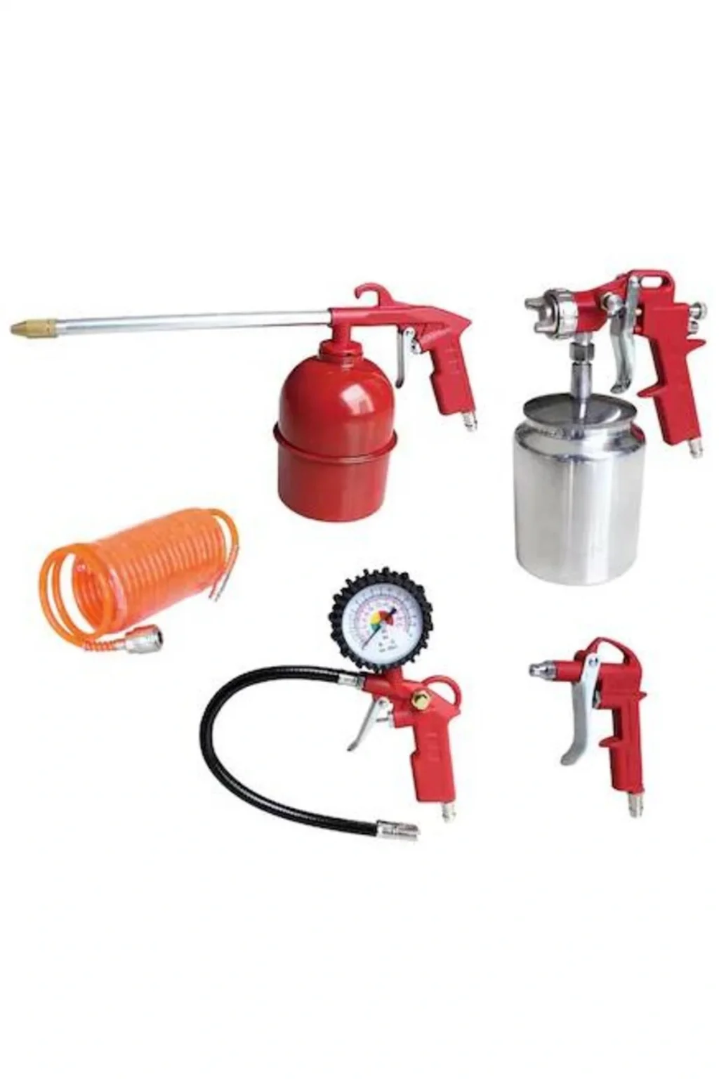 Attlas Havalı Kompresör Aksesuar Seti 5 Parça Boya TabancasıSaatli Lastik ŞişirmeHava Tabancası5 Mt.; Spiral HortumMazot TabancasıHava komprasörleri ile tam uyumludr.