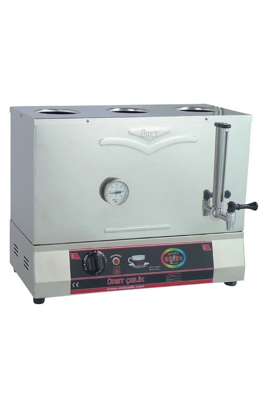 Teknik Özellikler 304 Kalite paslanmaz çeliktir.; Otomatik, ayarlanabilir termostatlıdır.; Yekpare üretimdir.; Su seviye göstergesi mevcuttur.; Gövde argon kaynaklıdır.; Metal muslukludur.; Termometre mevcuttur.; Su haznesine üstten 4-5 cm boş kalacak şekilde su doldurunuz. Termostat düğmesini 100 dereceye getiriniz. Isıtıcının çalıştığını gösteren lamba yanacak ve yaklaşık 20-25 dakika sonunda su kaynayacaktır. Su kaynadıktan sonra termostat derecesini 70-80 dereceye alınız. Dem haznesinde bulunan çay süzgecine kaynatmış olduğunuz suyu doldurunuz. Sonrasında istediğiniz miktarda çay koyunuz. Yaklaşık 10 dakika sonra çayınız demlenmiş olacaktır. Temizlik : Kullanırken suyun kireç düzeyine göre en az haftada bir kez cihaz limon tuzu ile talimata uygun şekilde temizlenmelidir. Dikkat Kesinlikle susuz çalıştırmayınız. Kireç sökücü olarak kesinlikle porçöz gibi kimyasal maddeler kullanmayınız. Kireçlenme ve susuz çalıştırma nedeniyle bozulan cihazlar garanti kapsamına girmez.