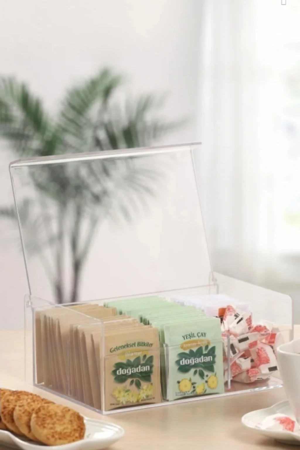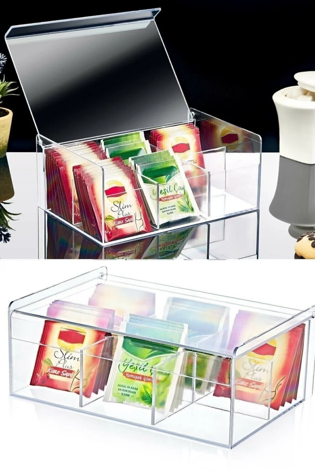 Çay Kutusu 6 Bölmeli Kapaklı Poşet Bitki Çayı Saklama Kabı Takılık Organizer Bu 6 bölmeli saklama kabı , çay kutusu , kapaklı poşetler ve bitki çayı nın düzenli bir şekilde saklanması için ideal bir seçenektir.; Ölçüleri şu şekildedir: Genişlik: Yaklaşık 21,7 cm ; Derinlik: Yaklaşık 14,9 cm ; Yükseklik: Yaklaşık 9 cm ; Bu çay kutusu sayesinde, poşet çay ve hazır kahvelerinizin düzenli bir şekilde saklaması mümkün olacaktır.; Ayrıca mutfak ve ofisinize şık bir görüntü katmanıza yardımcı olur.; Ürün, üç parçadan oluşmaktadır ve kolaylıkla sökülebilir ve temizlenebilir.; Böylece kullanımı ve bakımı oldukça pratik hale gelir.; Bu çay kutusu , mutfak veya ofisinizdeki düzeni sağlamak ve çay ya da kahve malzemelerinizi kolayca bulabilmenizi sağlamak için tasarlanmıştır.; Şık ve kullanışlı bir çözüm sunarak, mutfağınıza veya ofisinize düzenli bir görüntü kazandırır.; Bu çay organizeri ni ister takı organizeri , ister makyaj organizeri olarak da kullanabilirsiniz.