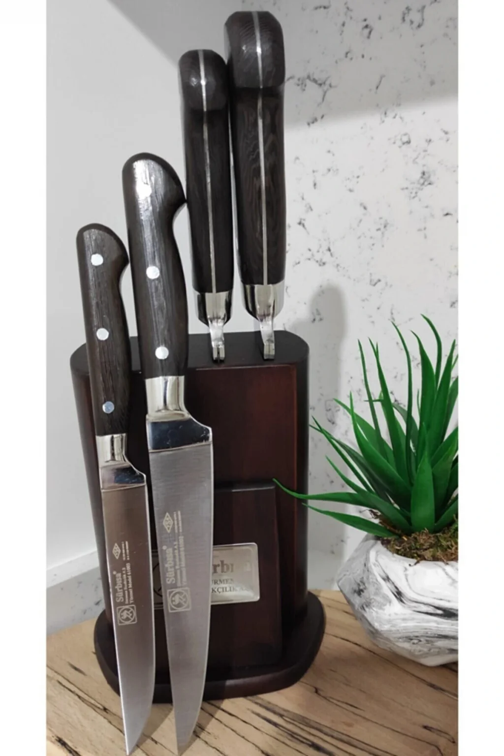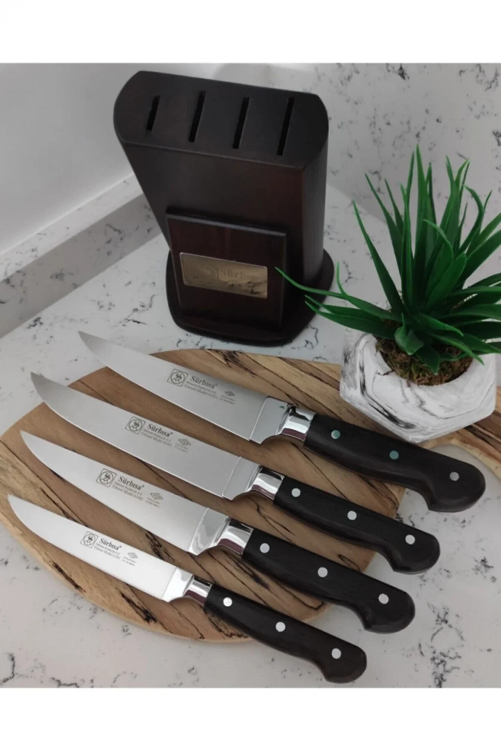 Içeriğinde bir adet 14,5 cm çelik boylu kemik sıyırma bıçağı, bir adet 17 cm ekmek bıçağı, bir adet 15 cm mutfak bıçağı ve bir adet 12,5 cm salata bıçağı ve ahşap stnad içerir.