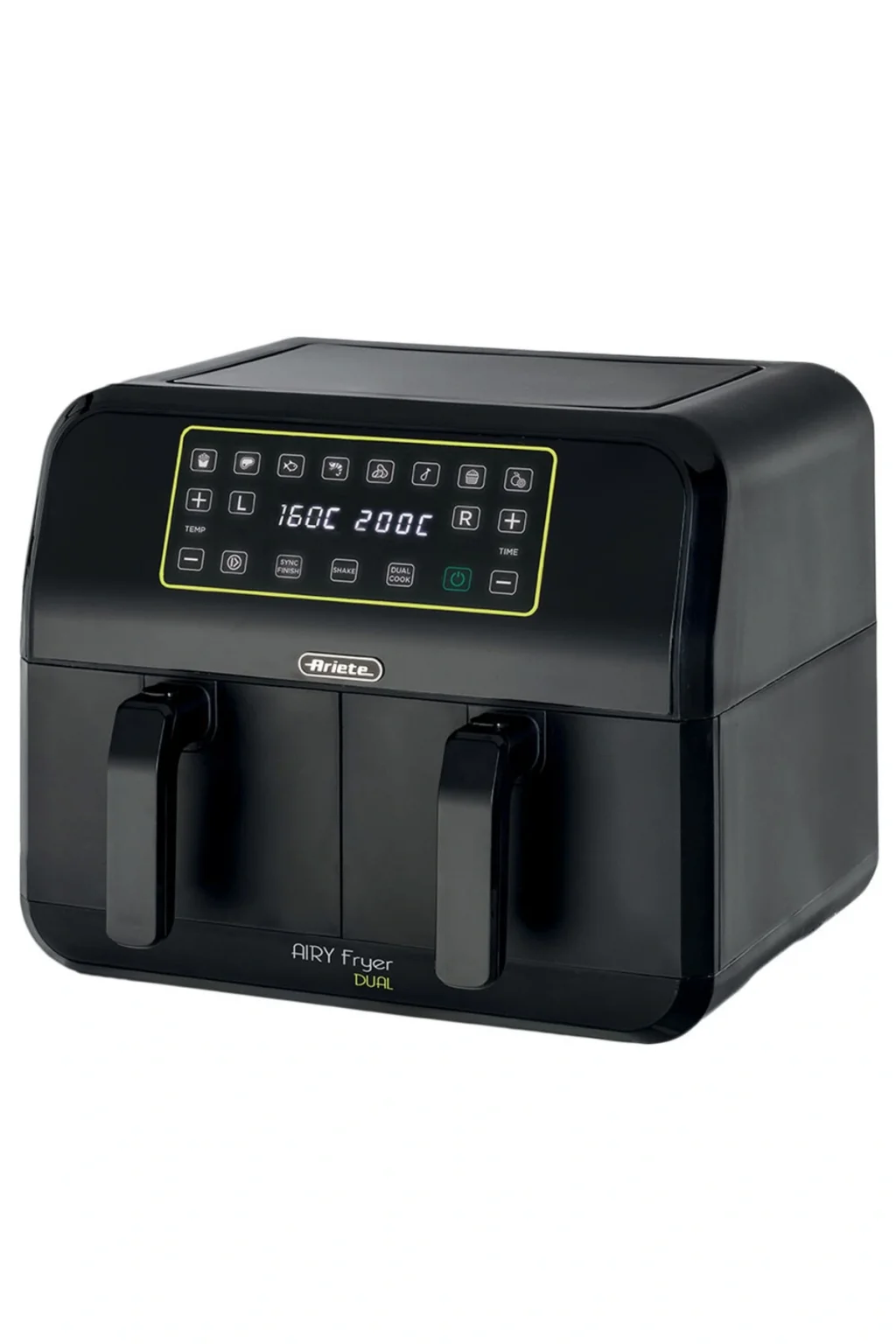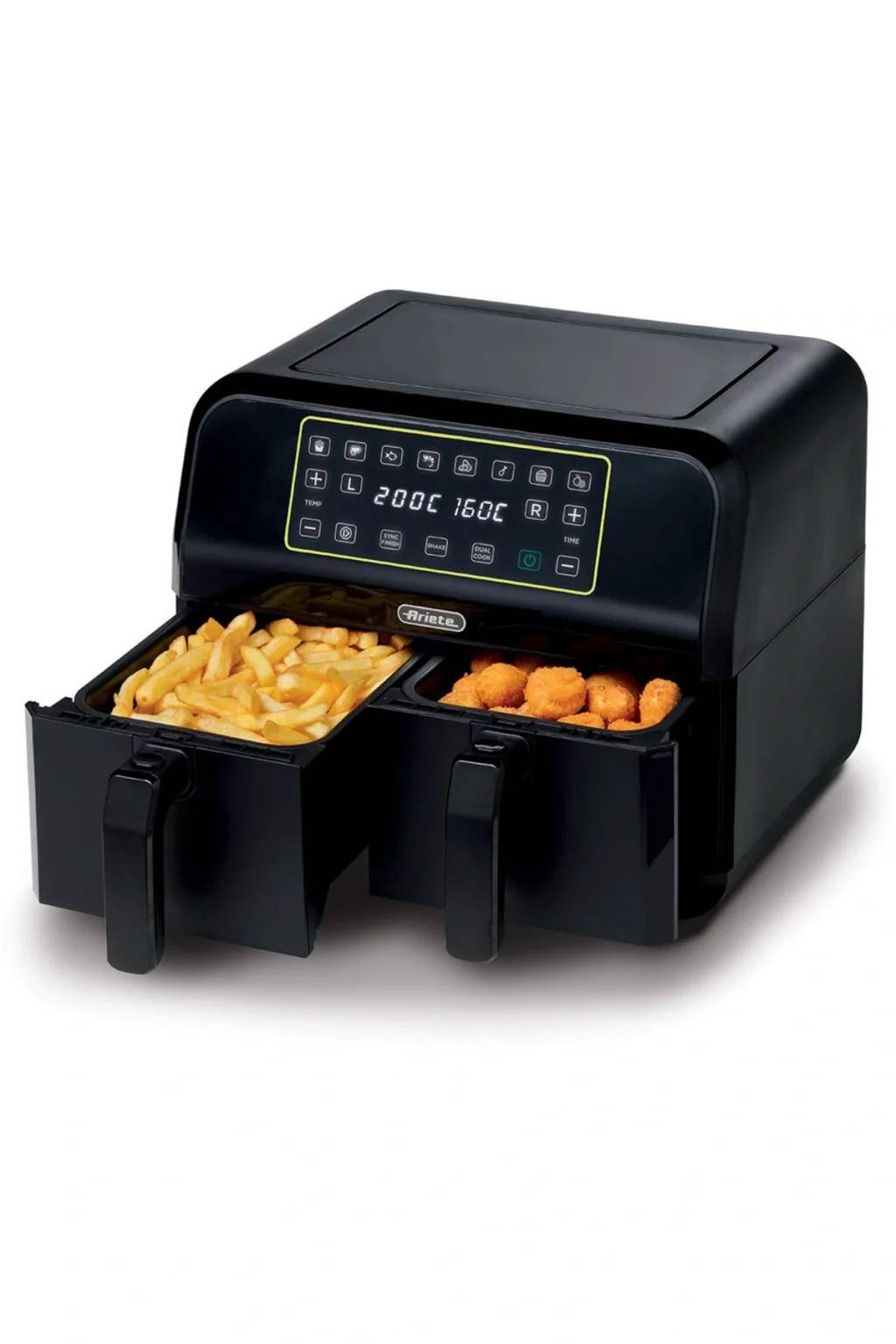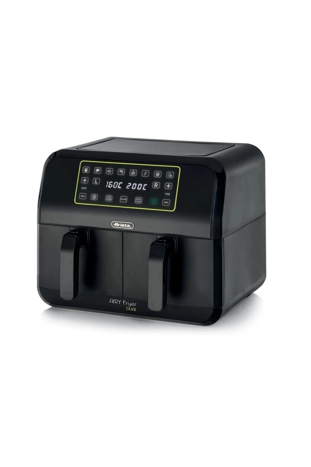 Ariete airy fryer çift hazneli hava fritözü ile hem lezzetli hem de sağlıklı bir yemek için sadece bir kaşık yağ kullanarak herhangi bir yemeği iki katı miktarda pişirebilirsiniz. Her biri 4 litre ve 2 ayrı hazneli olan (toplam 8 lt) Ariete'nin Airy Fryer Çift hazneli hava fritözü ile tek seferde 3,4 kg patates kızartabilirsiniz. Sadece patates kızartması değil; köfte, balık, et ve diğer birçok çeşit pişirilmeye hazır dondurulmuş, taze ve yeni unlanmış yiyecekleri 8 ön ayarlı programı sayesinde pişirebilmektedir. Ariete Airy Fryer Dual - Çift Hazneli Hava Fritözü Nasıl Çalışır? Hava fritözü, pişirme haznesinin içinde maksimum hızda ve 360° dolaşan, 35 °C'den 200 °C'ye kadar ayarlanabilen yüksek sıcaklıktaki hava sayesinde yemek ğişirir ve içerideki ısının eşit dağılımını garanti eder. Yemeklerin içlerinde eşit oranda pişirilmeyi ve dış yüzdeydeki çıtır dokuyu oluşturan sıcak hava dolaşımı geleneksel yöntemleri aratmamaktadır. Sıcak hava sayesinde lezzetli bir kızartma elde etmek için çok fazla yağ eklemeye gerek kalmaz. Bir kaşık yağ yeterlidir. Bu sayede tüm aile için daha hafif ama lezzetli yiyecekleri sofranıza getirebileceksiniz. İkili pişirme fonksiyonu ile aynı anda iki farklı yemek pişirebilir veya büyük miktarda bir yemeği 2 sepete bölerek pişirebilirsiniz.