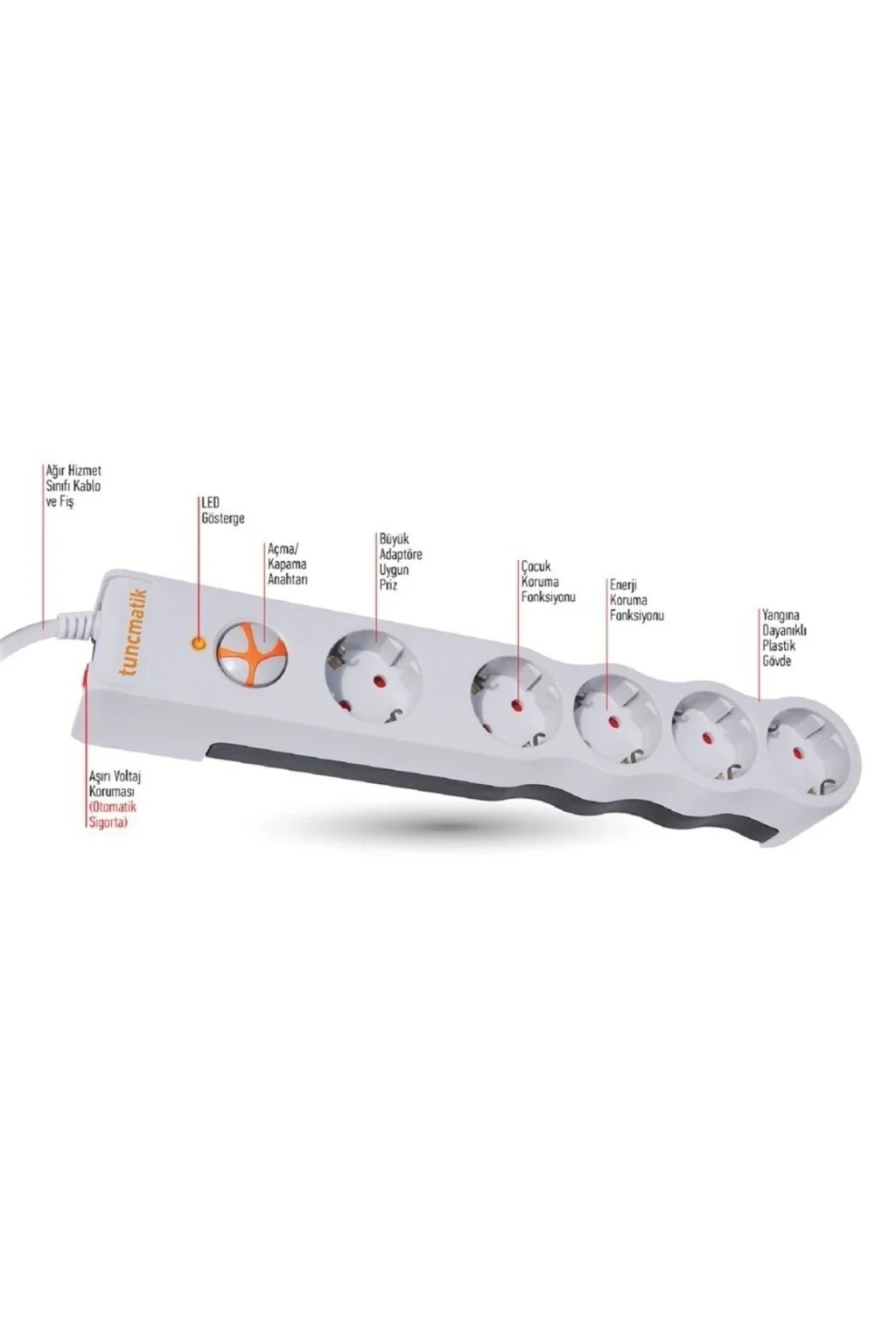 TUNÇMATİK-AK6134 AKIM KORUMALI PRİZ 5'Lİ (BEŞLİ) BEYAZ 1,5 MT