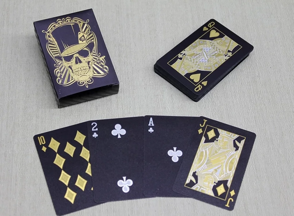 ALTIN KURU KAFA TASARIMLI SİYAH İSKAMBİL OYUN KARTIÜrün ÖzellikleriAltın kuru kafa tasarımlı siyah iskambil oyun kartı, dikkat çekici tasarımıyla klasik iskambil keyfine farklı bir hava katar. 9x6 cm boyutunda üretilen bu özel deste, siyah zemin üzerine altın işlemelerle süslenmiştir. Dayanıklı yapısı uzun ömürlü kullanım sağlarken, estetik kutusu sayesinde hediye olarak da tercih edilebilir. Oyun severler için farklı bir deneyim sunarken, koleksiyoncular için de eşsiz bir parçadır.Paket İçeriği1 adet Altın Kurukafa Tasarımlı Siyah İskambil Oyun Kartı Destesi