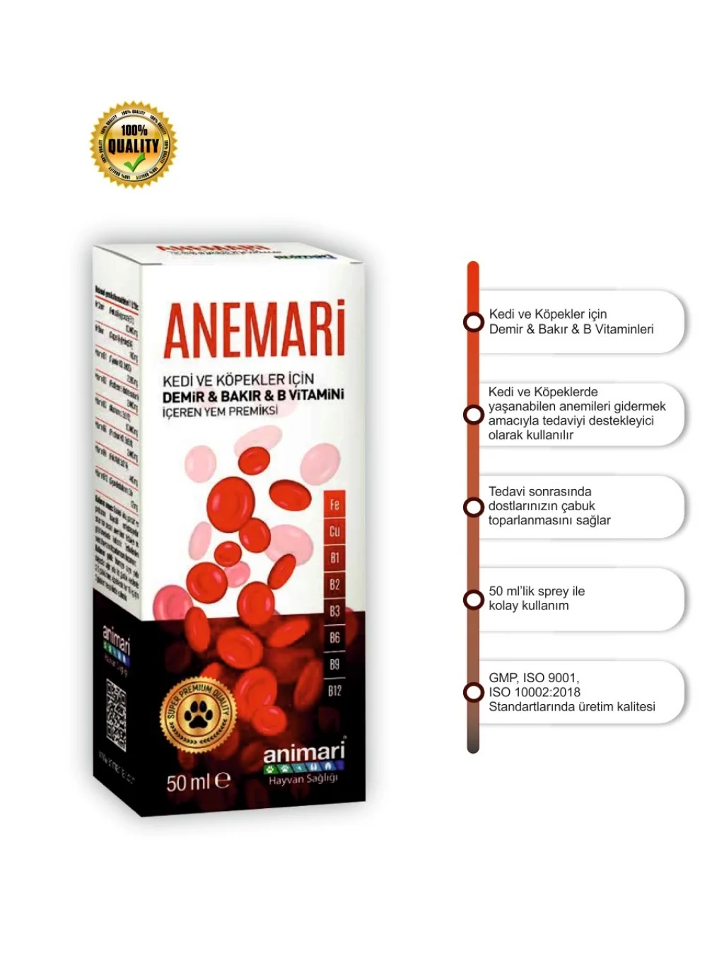 Anemari Demir Bakır B vitamini damlası 50 ml - 13068-2 - - Anemari Demir Bakır B vitamini damlası 50 ml Kedi ve Köpekler için Demir & Bakır & B Grubu Vitaminleri içerir Kedi ve köpeklerde yaşanan anemilerde destekleyici olarak kullanılır. G&uum