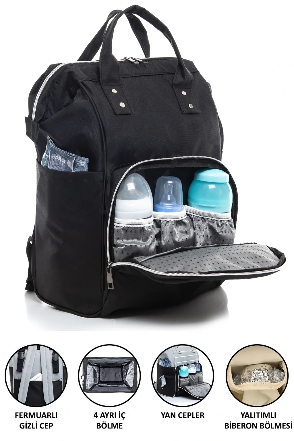 BEBEK BAKIM ÇANTASI Anne Bebek Bakım ve Hastane Çıkışı Doğum Sonrası Bebek Bezi Bebek Maması Bebek Kıyafeti Bebek Battaniyesi Gibi Bebek Bakımı İçin Gerekli Tüm Eşyalarınızı Koyabileceğiniz Anne Bebek Sırt Çantası. ANNE BEBEK BAKIM ÇANTASI ÖZELLİKLERİ Bebek Arabası Askı Apar-atlı Anne Çantası ; Dayanıklı Leke Tutmaz Temizlenebilir Su Geçirmez Kot Kumaş ; Bebek Maması Ve Süt Gibi Isı Muhafazası Gerektiren Bebek Gıdaları İçin 3 Adet Yalıtımlı Termos Bölmesi ; Kız ve Erkek Bebekler İçin Pembe Gri Siyah Renkleri Mevcut ; 1 Kg Ağırlığında Hafif Doğum Çantası ; Büyük Boy Anne Çantası Yükseklik:42 cm En:20 cm Genişlik:28 cm ; 1.Geniş İç Hacimli Ana Bölme ve 13 Ayrı Bölme 2.Ön Tarafta Fermuarlı 3 Adet Yalıtımlı Termos Bölme 3.Arka Tarafta Fermuarlı Kişisel İhtiyaçlar İçin Gizli Bölme 4.Sağ Ve Sol Yanda İki Adet Bebek Temizleme Mendili Gibi Bebek Bakım Ürünleri İçin Bölme 5.İç Kısımda Ana Bölmeden Ayrı Biri Fermuarlı 4 Adet Ayırıcı Bölme