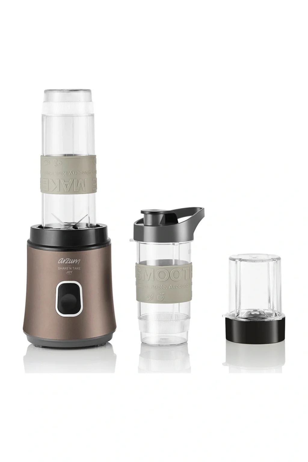 AR1101-T Shake'N Take Joy Personal Blender Ürün Özellikleri Güç (W) : 600 W Buz Kırabilme Özelliği : Var Bıçak Sayısı : 4 Doğrayıcı Bıçak Sayısı : 4 Tek Tuşla Çalışma Özelliği : Var Doğrayıcı Hazne Kapasitesi (L) : 400 ml ,570 ml Çırpıcı Aparat : Yok Ölçü Kabı : Yok Hız Ayarı : Yok Turbo Fonksiyonu : Var Aksesuarlar : Kahve ve Baharat Öğütücü,İçme Kapağı,Öğütücü Bıçak Pulse Fonksiyonu : Var
