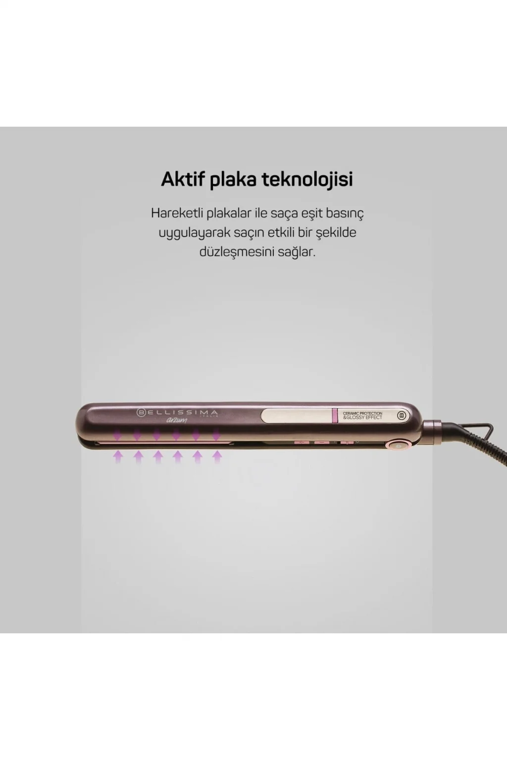 Yüksek ısı dereceli düzleştirici çeşitlerinden biri olan model, 150 ve 230 derece aralığında geniş ısı seviyelerine sahiptir.; Kişilerin tercihlerine veya saç tiplerine göre bu aralıklardan birini seçerek şekillendirmeyi kolay hale getirir.; Plakası seramik saç düzleştirici, yüksek ısılarda bile saçların zarar görmemesine destek olur.; Seramik yüzeyi ile de saçların kolayca kayarak düzleştirme işlemini rahatça yapar.; ; 230 derece saç düzleştirici profesyonel kullanıma uygun yapısı sayesinde kısa süre içinde düzleştirme işlemini tamamlamaya yardımcı olan özelliğiyle yüksek kaliteye sahiptir.; Seramik plakaları sayesinde saç yakmayan düzleştirici çeşitlerinden biri olan model, saçlarınızın doğal görünümünü ve ışıltısını koruma imkanı verir.; Saçı yıpratmayan düzleştirici, Aktif Plaka teknolojisi sayesinde her iki plakanın da eşit düzeyde basınç uygulaması sunarak saç düzleştirme işlemini kolaylaştırır.; AR5062 modeli, çalıştırıldıktan sonra kısa sürede ısınarak zamandan ve enerjiden tasarruf etme imkanı sunarak pratik kullanıma destek olur.; Arzum Bellissima Creativity Glossy Saç Düzleştirici, özel gövde tasarımı ile saçları düzleştirirken veya bukle yaparken kolaylık sağlar.; ; Pembe AR5062, kullanılırken gövdesinde bulunan + tuşuna uzun basıldığında kendisini kitleyerek yanlışlıkla ısı değişimi oluşumunu önler.; LED ekranı bulunan Arzum AR5062 Bellissima Creativity Glossy Saç Düzleştirici, çalıştırıldıktan sonra hazır olduğunu ve ısı derecelerini göstererek yüksek avantaj sağlar.;