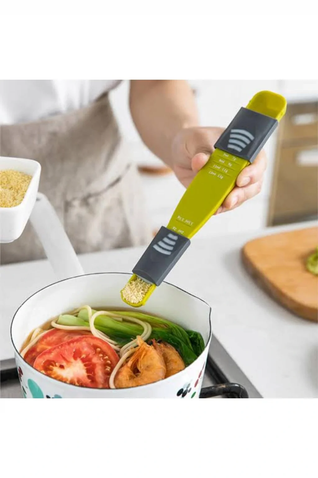 AYARLANABİLİR ÖLÇÜM KAŞIĞIAyarlanabilir ölçüm kaşığı, pratik bir mutfak aracı olarak öne çıkıyor.; Kaliteli ve sağlıklı plastik malzemeden üretilmiş olan bu kaşık, çatal veya kaşık boyutunda olup ergonomik bir tasarıma sahiptir.; Üzerindeki ayarlar sayesinde gram ve mililitre cinsinden ölçüm yapmak oldukça kolaylaşıyor.; Bu özellik, ölçü miktarını hassas bir şekilde ayarlayabilmek için ideal bir çözüm sunar.; Gelişmiş ölçüm kabiliyetiyle mutfakta daha hassas ve doğru ölçümler yapmayı sağlayarak yemek hazırlama sürecini daha keyifli hale getirir.; Ayrıca, ayarlanabilir ölçüm kaşığı, çeşitli tariflerde kullanılan farklı ölçümleri hızlı bir şekilde gerçekleştirmek için pratik bir çözümdür.; Hem gram hem de mililitre cinsinden ölçüm yapabilme özelliği, çeşitli mutfak ihtiyaçlarına cevap verebilir.; Bu sayede, yemek hazırlarken zaman kazanabilir ve tariflerde gereken doğru ölçümleri kolaylıkla elde edebilirsiniz.; Ayarlanabilir ölçüm kaşığı, mutfakta pratiklik ve kullanım kolaylığı arayanlar için ideal bir tercihtir.; Paket İçeriği1 adet ayarlanabilir ölçüm kaşığı