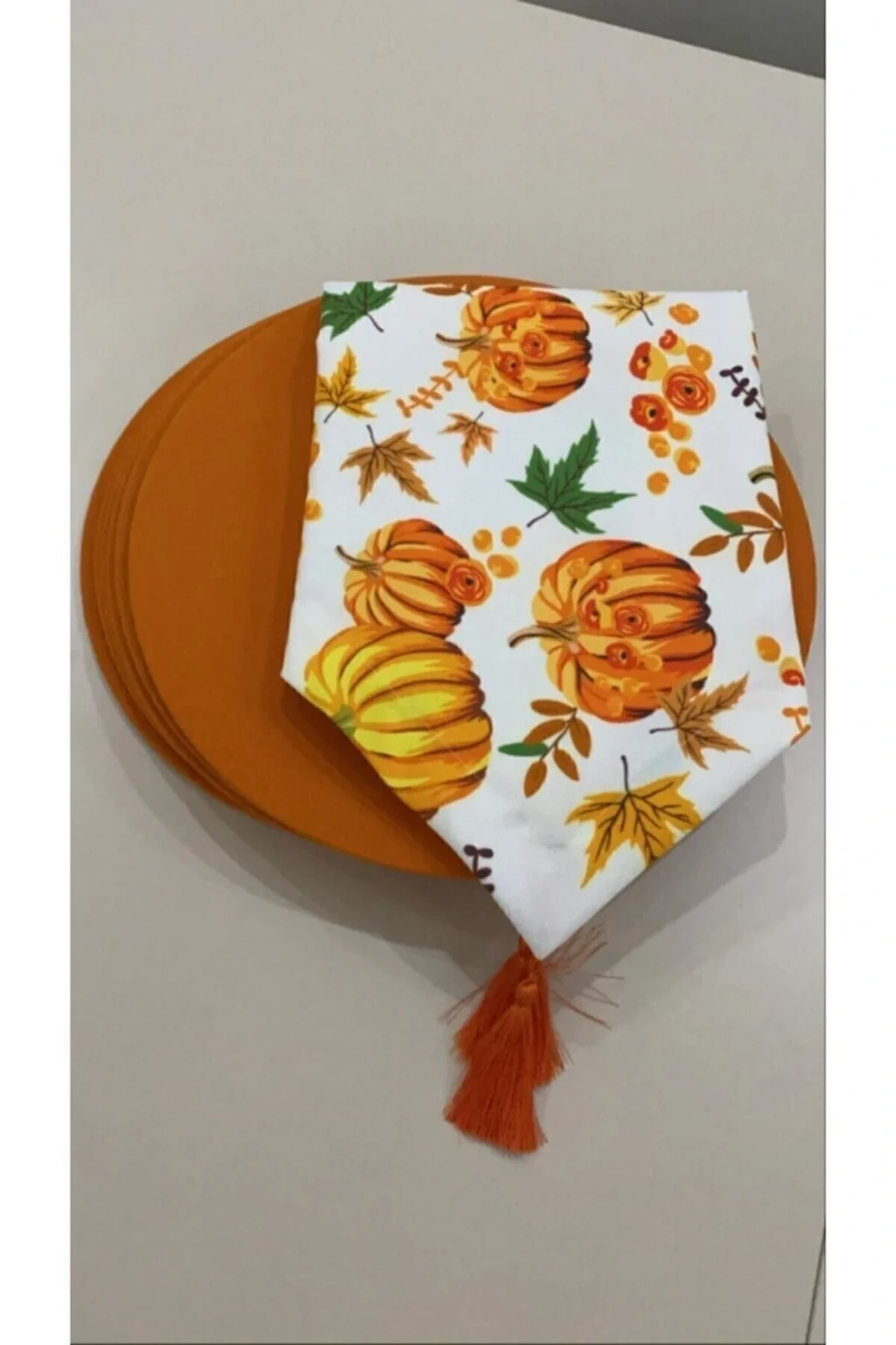 Balkabağı desenleriyle süslenmiş, balkabağı mevsiminin ruhunu sofralarınıza taşıyan bu runner ve supla seti ile sofralarınız şenlenecek.; Polyester materyal kullanımı sayesinde uzun ömürlü ve dayanıklıdır, sık kullanıma karşı dirençlidir.; Kolay temizlenebilir yapısı ile pratik kullanım sunar; 30 derecede makinede yıkanabilir.; Dikdörtgen formuyla çeşitli sofra düzenlerinde rahatlıkla kullanılabilir ve masa düzeninize uyum sağlar.; Polyester bileşeni sayesinde leke tutmaz özelliğe sahiptir, yemek sonrası temizlik işlemlerini kolaylaştırır.;