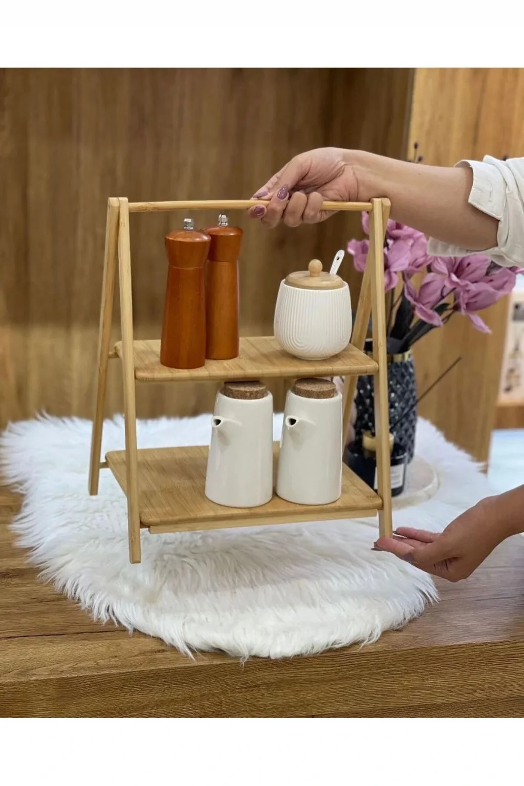 - Modern tasarımıyla mutfaklarınıza şıklık katan bambu iki katlı sunumluk, bej rengiyle her türlü dekorasyonla uyum sağlar.; - Ahşap malzemesi sayesinde dayanıklılığı ve doğal görünümü bir arada sunar; uzun süreli kullanım için idealdir.; - 10 x 10 cm boyutlarındaki bu raf, baharatlarınızı düzenli bir şekilde sergilemenize olanak tanırken, aynı zamanda dekoratif bir unsur olarak da işlev görür.; - Bej rengiyle sıcak ve samimi bir atmosfer yaratırken, mutfak tezgahınızda kolayca konumlandırabilirsiniz.