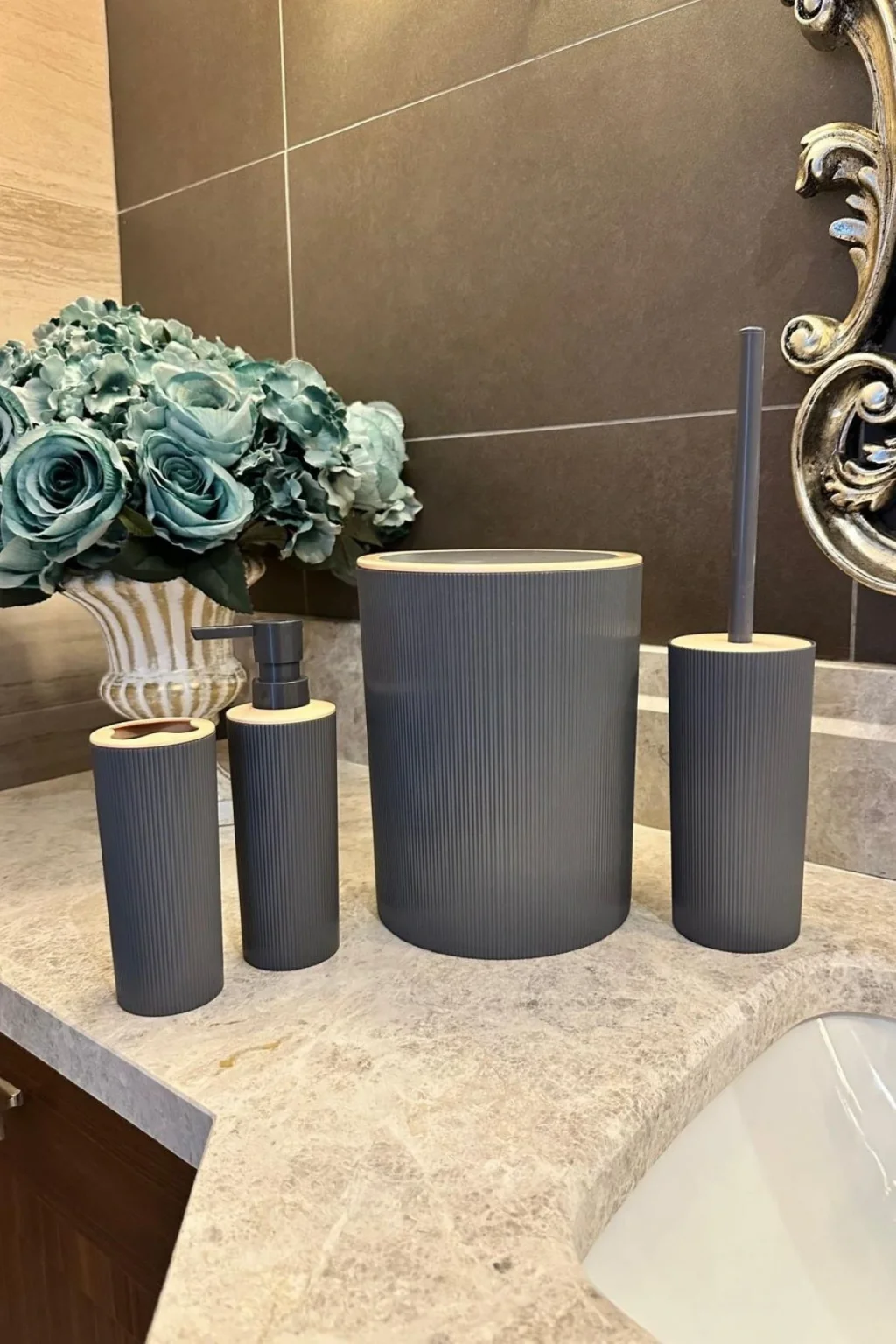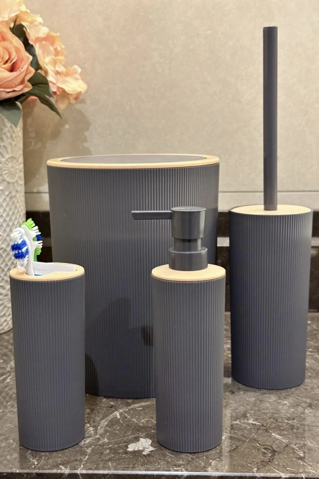 Bu zarif ve modern 4'lü banyo seti, banyonuzda şıklığı ve düzeni bir arada sunar. Yuvarlak hatlara sahip bu set, siyah, beyaz ve antrasit renk seçenekleri ile her türlü banyo dekorasyonuna uyum sağlar. Ürünlerin üzerindeki renksiz ince çizgi detayları ve üst ksımlardaki krem renk detayları, setin estetik görünümünü tamamlar. Dayanıklı plastik malzemeden üretilmiş olan bu set, uzun ömürlü kullanım sunar.