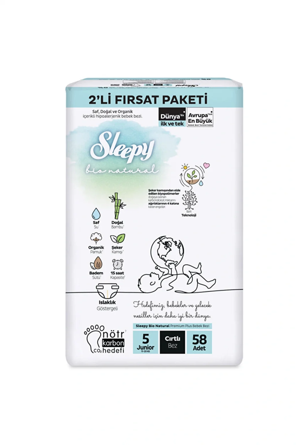 Islaklık göstergeli, doğal bambu, organik pamuk, şeker kamışı ve 15 saat kapasiteli Sleepy Bio Natural Bebek Bezi, saf su ile eşsiz yumuşaklık sunuyor.