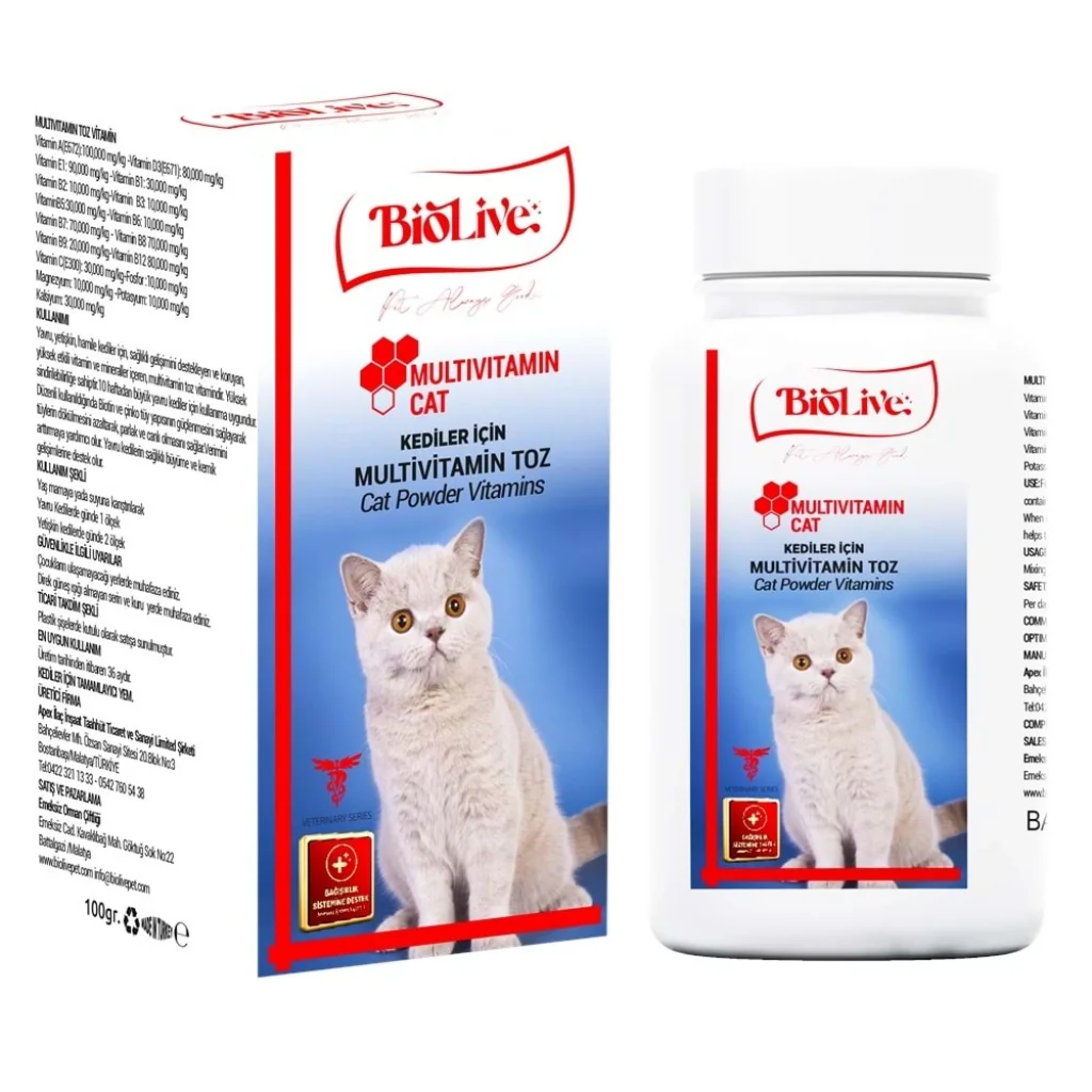 Biolive Kediler İçin Multivitamin Toz Vitamin 100gr - BIO-024 - - Biolive Kediler İçin Multivitamin Toz Vitamin 100gr Kullanım Alanı: Yavru, yetişkin, hamile kediler için, sağlıklı gelişimini destekleyen ve koruyan, yüksek etkili vitamin ve mineraller iç