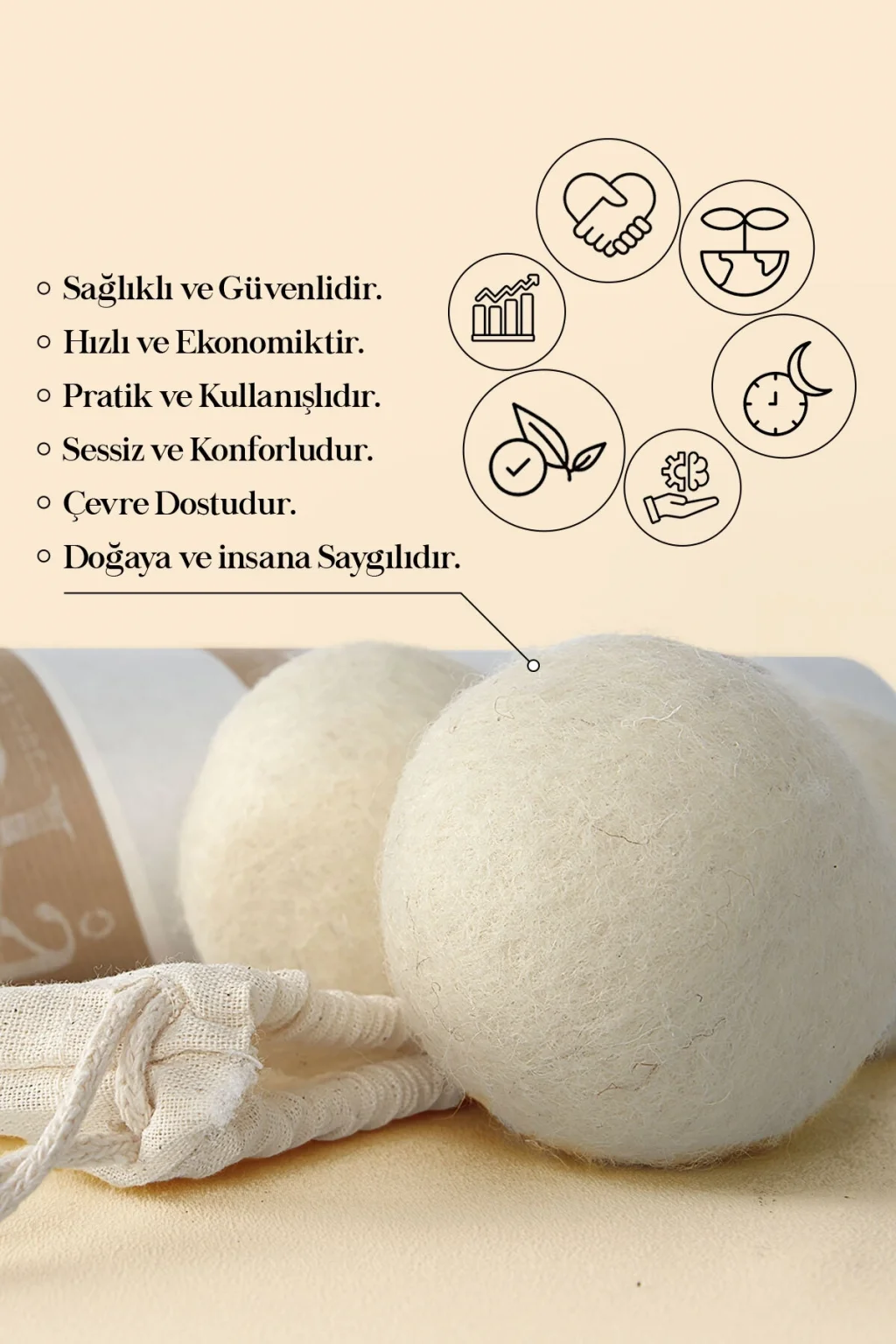 HASSAS CİLT yapınız, özellikle de ÇOCUKLAR ve BEBEKLERinizin sağlığı için, çamaşırlarınızı tamamen DOĞAL ve ZARARSIZ yün kurutma topları ile tanıştırın. Çok daha YUMUŞAK, daha AZ KIRIŞIK ve daha AZ TÜYLENMİŞ halde; daha HIZLI ve daha AZ ENERJİ ile, en önemlisi de en ÇEVRE DOSTU yöntemle kurutacaksınız.