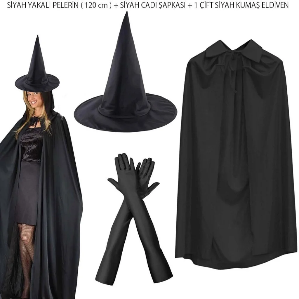BUĞZ 120 cm Siyah Yakalı Cadı Pelerini Cadı Şapkası ve 1 Çift Siyah Kumaş Eldiven Seti 3 Parça
