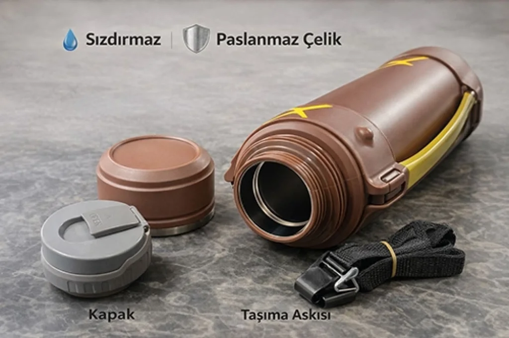 1600 ML ÇİFT KATMANLI VAKUMLU PASLANMAZ ÇELİK TERMOS Ürün ÖzellikleriDoğa tutkunları ve uzun yol seyahatleri için tasarlanan 1600 ml Çift Katmanlı Vakumlu Paslanmaz Çelik Termos, yüksek kapasitesi ve profesyonel ısı korumasıyla tüm beklentilerinizi karşılar. Yüksek kaliteli paslanmaz çelikten üretilen çift katmanlı vakumlu yapısı, içeceklerinizin ısısını saatlerce muhafaza ederek ilk anki tazeliğini korur. 29x13 cm boyutlarındaki kompakt ve sağlam gövdesi, outdoor şartlarına uygun darbe emici dış katman ve ergonomik sabit taşıma sapı ile donatılmıştır. Sızdırmaz kilitli iç kapak sistemi güvenli bir kullanım sunarken, dış kapağın bardak fonksiyonu görmesi sayesinde ekstra ekipman taşımanıza gerek kalmaz. Hem sıcak hem de soğuk içecekler için mükemmel performans sunan bu termos, kamp, avcılık ve uzun yolculuklarda en güvenilir yol arkadaşınız olacaktır.Ürün Teknik ÖzellikleriÖzellikAçıklamaHacim1600 ml (1.6 Litre)Boyutlar29 cm (Yükseklik) x 13 cm (Çap)MalzemePaslanmaz Çelik (İç ve Dış Çift Katmanlı Vakumlu Gövde)YalıtımGelişmiş Vakum Teknolojisi (Sıcak & Soğuk Koruma)Kapak ÖzelliğiBardak Olarak Kullanılabilen Dış Kapak + Sızdırmaz İç KapakTaşımaErgonomik ve Sağlam Sabit Taşıma KoluRenk SeçeneğiGörseldeki Renklerden Karışık GönderilmektedirPaket İçeriği1 Adet 1600 ml Çift Katmanlı Vakumlu Paslanmaz Çelik Termos.