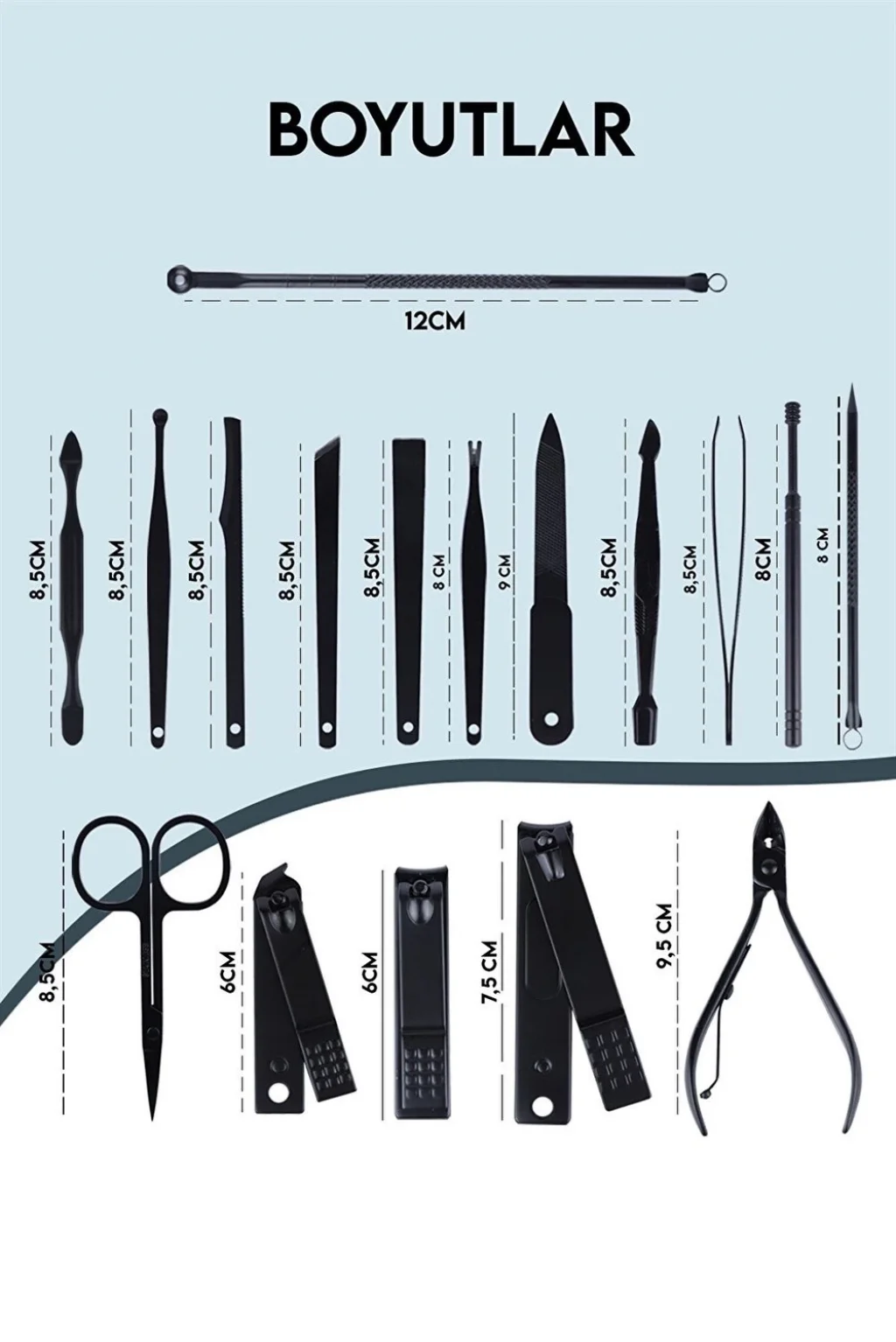1 büyük tırnak makası1 küçük tırnak makası1 sivri uç tırnak makası ( Tırnaklara şekil vermek için )1 çift uçlu komedon1 törpü1 et ittirici1 çift taraflı tırnak kaldırma aleti1 makas1 pedikür bıçağı ( ayak tabanları için )1 çarpraz pedikür bıçağı ( ayak tabakları için )1 kavisli pedikür bıçağı ( ayak tabanları için )1 V şeklinde et itme ( Tırnak çevresinde ki ölü deriyi temizleme )1 itme çubuğu ( Tırnak içinde ki ve çevresinde ki kirleri temizler )1 tırnak temizleme 1 cımbız1 iğneli komedon1 kulak temizleme