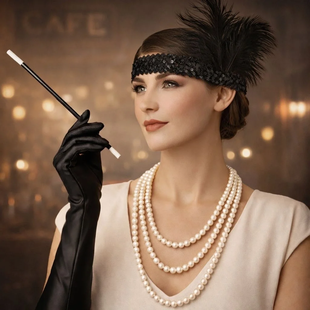 Zarif ve dikkat çekici bir stil için özel olarak hazırlanan 1920&rsquoler Çarliston Aksesuar Seti, dönemin ikonik detaylarını bir araya getirir. Işıltılı ve sofistike görünüm sunan bu set, konsept davetler, temalı organizasyonlar, sahne performansları ve fotoğraf çekimleri için ideal bir tamamlayıcıdır.