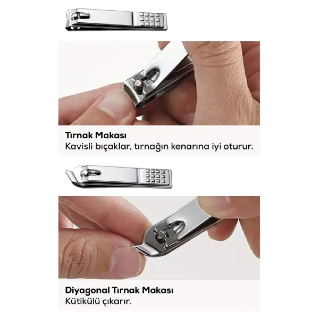 2'Lİ PROFESYONEL TIRNAK MAKASI SETİÜrün Özellikleri2'li Profesyonel Tırnak Makası Seti, el ve ayak tırnak bakımını pratik ve kontrollü şekilde yapmanızı sağlayan iki farklı tasarıma sahip makastan oluşur. Set içerisinde yer alan klasik model, kavislendirilmiş bıçak yapısı sayesinde tırnağın doğal formuna uyum sağlar ve düzgün kesim imkânı sunar. Diyagonal tasarıma sahip diğer makas ise özellikle köşe ve kenar bölgelerinde hassas işlem yapılmasına yardımcı olur. Keskin ve dayanıklı yapıya sahip profesyonel tırnak makası tasarımı, tırnak yüzeyini zorlamadan temiz bir kesim sağlar. Ergonomik gövde yapısı sayesinde elde rahat tutulur ve kayma yapmadan güvenli kullanım sunar. Günlük kişisel bakım rutinlerinde ya da detaylı manikür uygulamalarında tercih edilebilecek bu 2'li tırnak makası seti, hem ev kullanımı hem de profesyonel kullanım için uygundur. Kompakt boyutu sayesinde çanta içinde taşınabilir ve seyahatlerde rahatlıkla kullanılabilir.Ürün Teknik Özellikleri Özellik Açıklama Ürün Adı 2'li Profesyonel Tırnak Makası Seti Set İçeriği 1 adet klasik tırnak makası, 1 adet diyagonal tırnak makası Bıçak Yapısı Kavisli ve diyagonal kesim tasarımı Kullanım Alanı El ve ayak tırnak bakımı Kullanım Türü Kişisel ve profesyonel kullanım Paket İçeriği1 adet klasik tırnak makası1 adet diyagonal tırnak makası