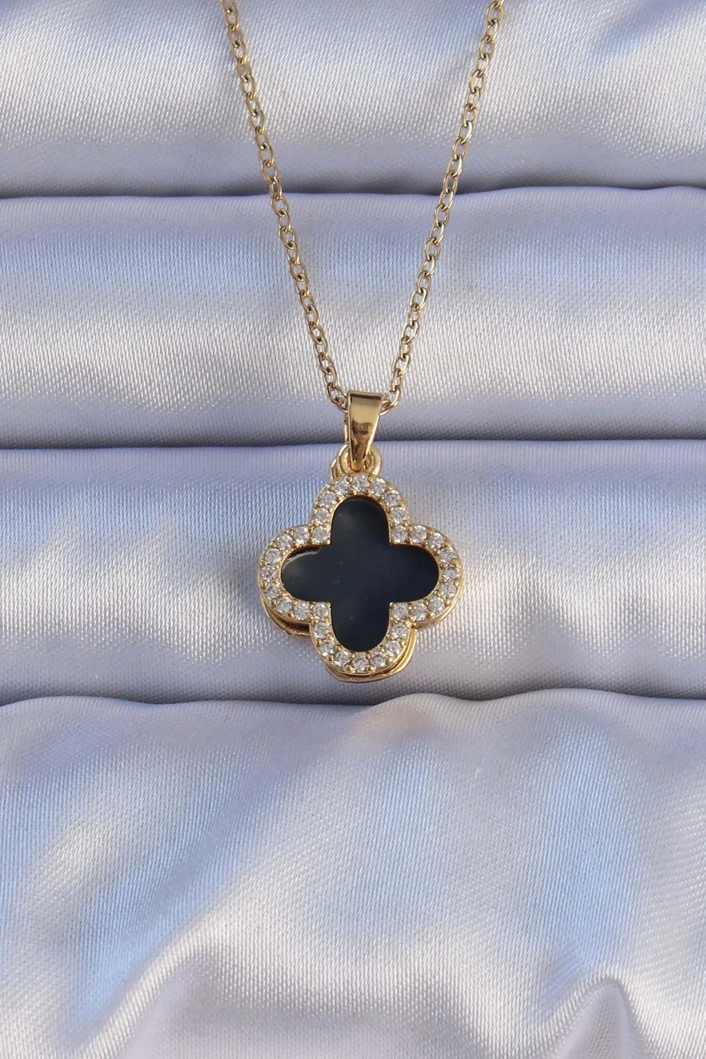 BUĞZ 316L Çelik Gold Renk Siyah Mineli Zirkon Taşlı Yonca Figürlü Kolye