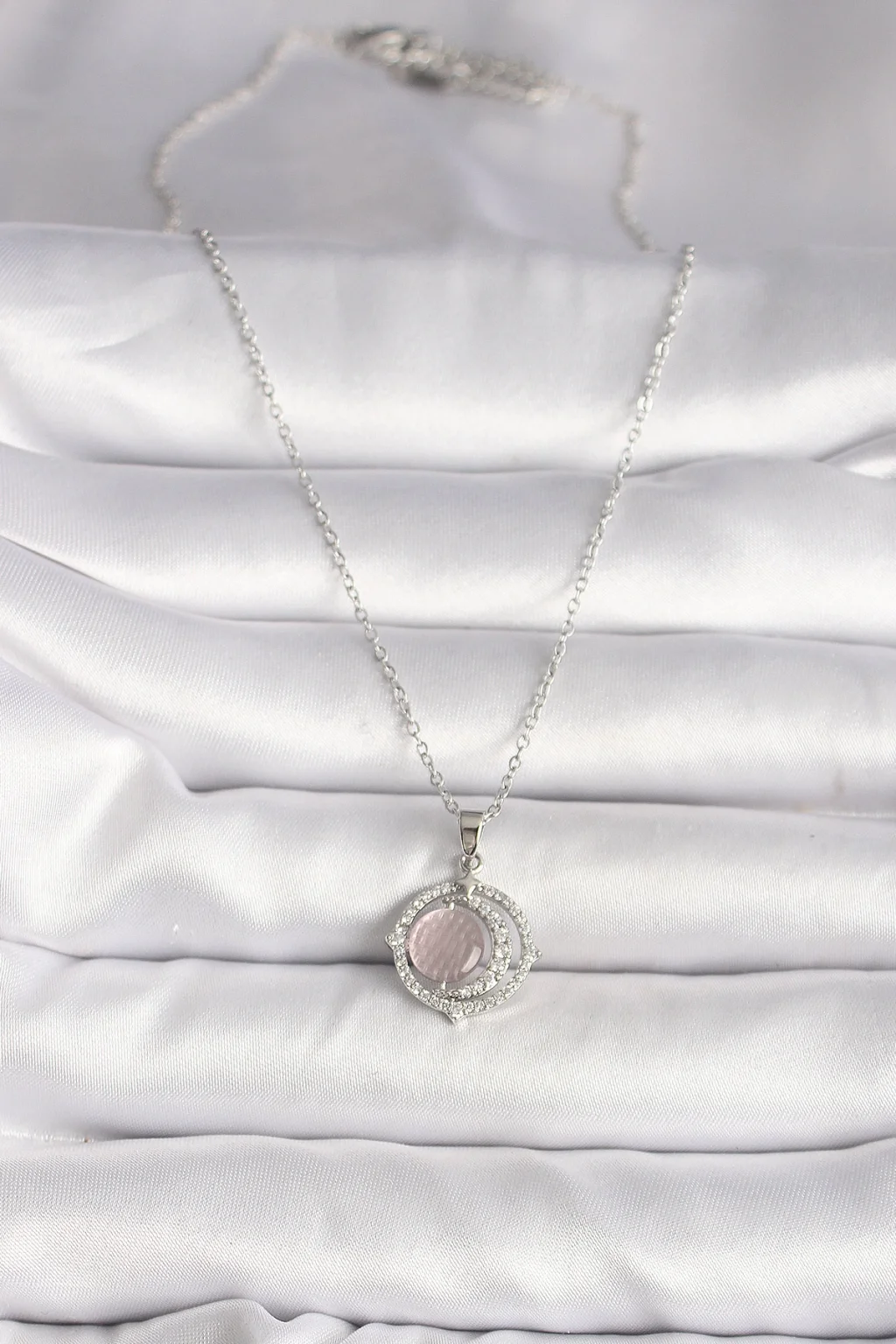BUĞZ 316L Çelik Gümüş Renk Zirkon Taşlı Pembe Sedefli Hilal Model Kadın Kolye - BUĞZ