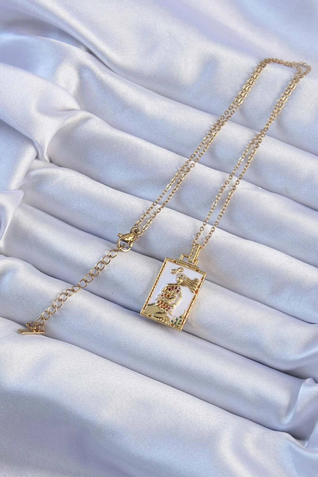 BUĞZ 316L Çelik Zincir Altın Renk Beyaz Mineli Tarot Kolye - Lisinya