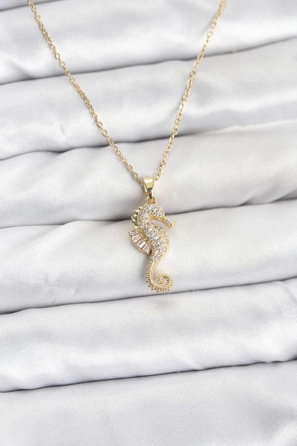 BUĞZ 316L Çelik Zincir Gold Renk Deniz Atı Model Zirkon Taşlı Kadın Kolye