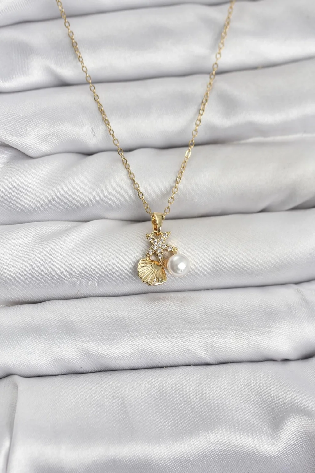 BUĞZ 316L Çelik Zincir Gold Renk Deniz Kabuğu ve Deniz Yıldızı Model Zirkon Taşlı Kadın Kolye