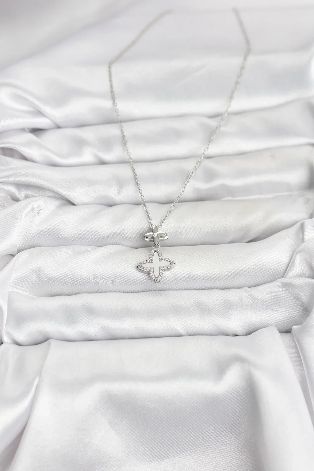 BUĞZ 316L Çelik Zincir Gümüş Renk 4 Yapraklı Yonca Model Zirkon Taşlı Kadın Kolye