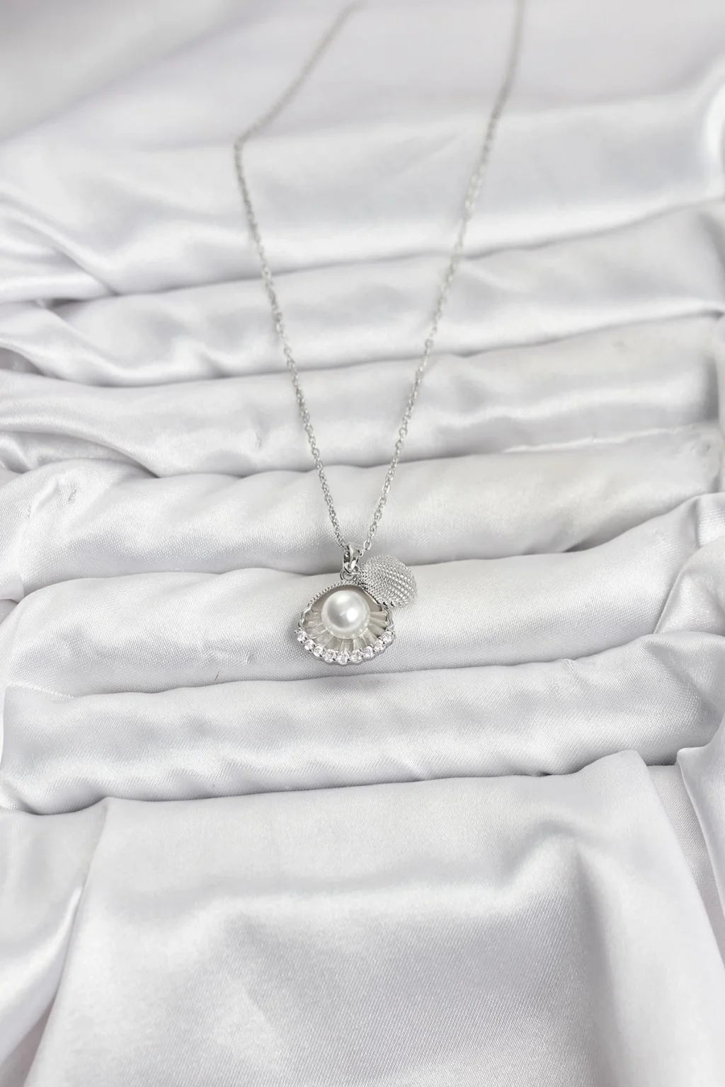 BUĞZ 316L Çelik Zincir Gümüş Renk İncili Deniz Kabuğu Model Zirkon Taşlı Kadın Kolye