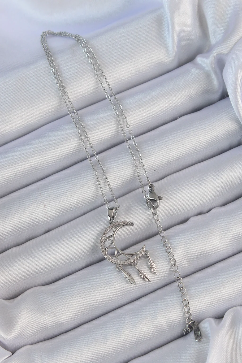 BUĞZ 316L Çelik Zincir Gümüş Renk İşlemeli Zirkon Taşlı Ay Kolye - Lisinya