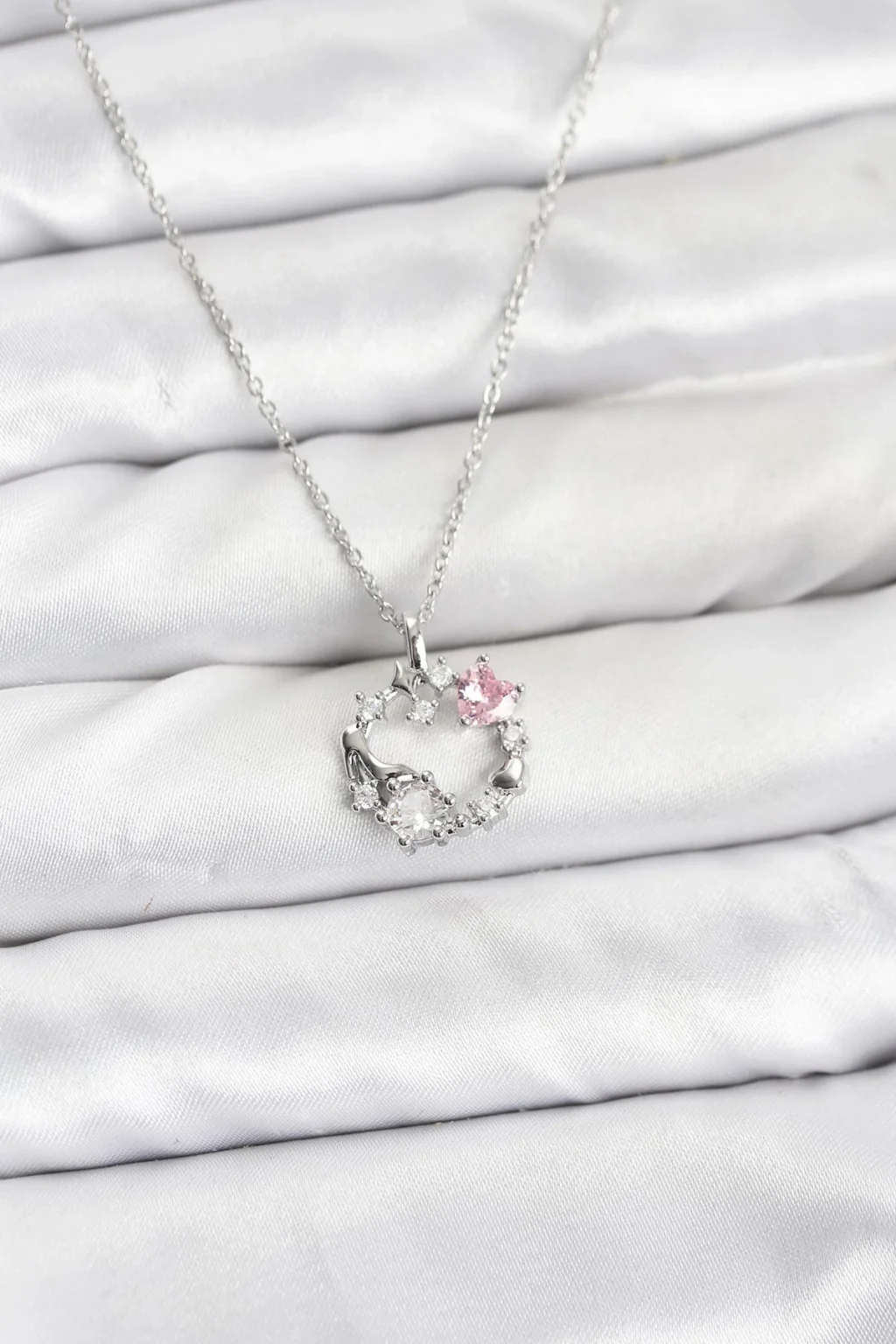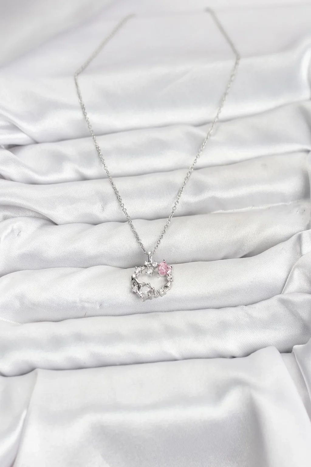 BUĞZ 316L Çelik Zincir Gümüş Renk Pembe Taş Detaylı Çelenk Model Kadın Kolye