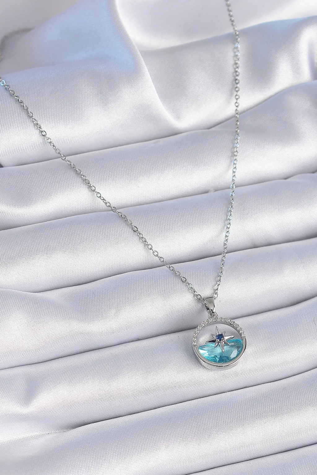 BUĞZ 316L Çelik Zincir Gümüş Renk Zirkon Taşlı Deniz Görünüm Kutup Yıldızı Kolye