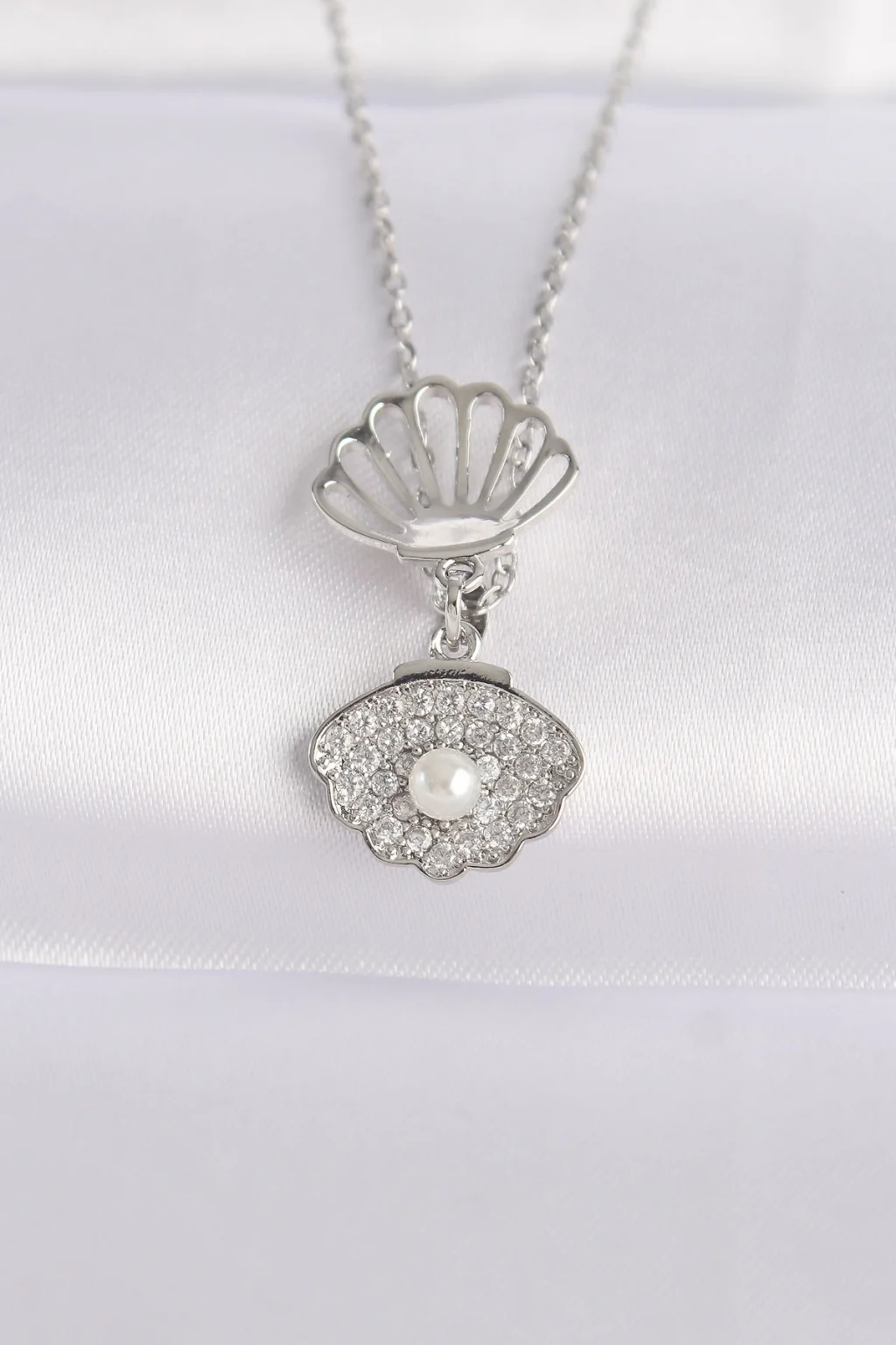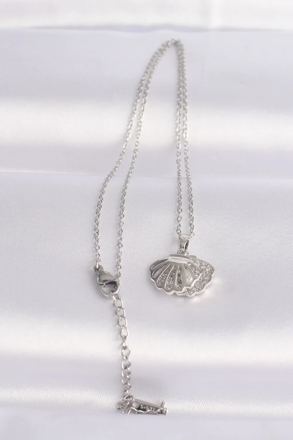 BUĞZ 316L Çelik Zincir Gümüş Renk Zirkon Taşlı İnci Detay İstiridye Kolye