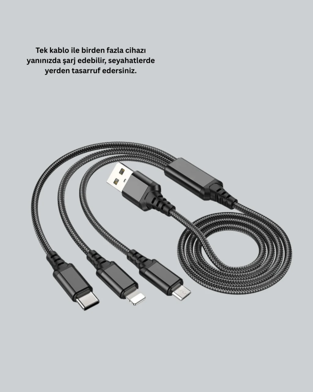 Bu 3’ü 1 arada hızlı şarj kablosu, iOS, Android ve Type-C girişli tüm cihazlarla uyumludur. 1,2 metre uzunluğu ile günlük kullanımda ideal mesafe sunar. Aynı anda birden fazla cihazı şarj edebilme özelliği sayesinde priz kalabalığını ortadan kaldırır. Metal alaşımlı dış kaplama ve TPE malzemesi ile sağlam ve dayanıklıdır. Paslanma, oksitlenme ve kırılmalara karşı korunaklı yapısı uzun ömürlü kullanım sağlar. Dahili akıllı çip teknolojisi, cihaz pilini korur ve güvenli şarj sağlar. Saf bakır tel çekirdeği, düşük direnç ile hızlı şarjı mümkün kılar. Evde, işte veya seyahatte tüm cihazlarınızı tek kablo ile şarj edebilme kolaylığını sunar.Ürün Markası: Lisinya