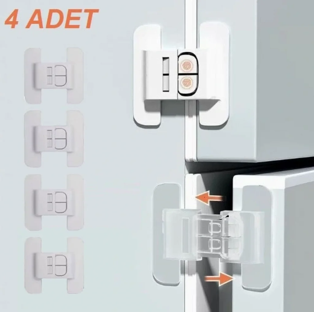 4 ADET BUZDOLABI ÇEKMECE VE DOLAP KAPAĞI ÇOCUK KİLİDİÜrün Özellikleri4 Adet Buzdolabı Çekmece ve Dolap Kapağı Çocuk Kilidi, evdeki tehlikeli alanlara çocukların erişimini engelleyerek güvenli bir yaşam alanı oluşturmak için tasarlanmış pratik bir güvenlik çözümüdür. Çift butonlu güvenlik mekanizması sayesinde kilidin açılması için iki tuşa aynı anda basılması gerekir; bu işlem yetişkinler için son derece kolayken çocukların motor becerileri bu eylemi yapmaya yeterli olmayacağı için güvenliğinizi maksimum seviyeye taşır. Buzdolabı, çekmece, gardırop, derin dondurucu veya düz yüzeyli tüm dolap kapaklarında rahatlıkla kullanılabilir ve geniş uyumluluk sunar. Güçlü yapışkan bantları sayesinde montajı delme ya da vidalama gerektirmez, mobilyalara zarar vermeden saniyeler içinde uygulanabilir. Modern, sade ve estetik tasarımı ise beyaz eşyalar ve mobilyalar üzerinde göze batmadan doğal bir görünüm sağlar. Çocuklu evler için olmazsa olmaz güvenlik önlemlerinden biridir.Paket İçeriği4 adet çocuk güvenlik kilidi.