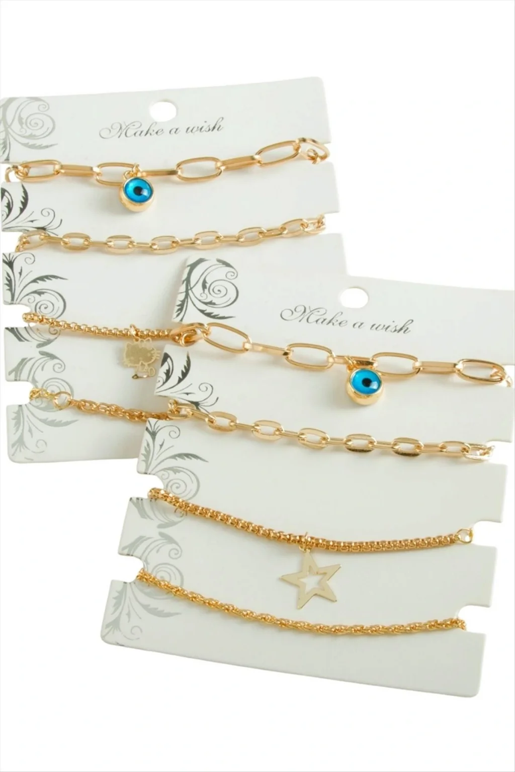 Bileklik; Ürün malzemesi metaldir. Kartlıdır. 1 kartta 4 adet zincir bileklik olarak gönderilecektir. Zincir uzunluğu 19 cmdir. Ürün ortasında figür modelleri asortildir. Siparişlerinizde karırışık olarak gönderilecektir.