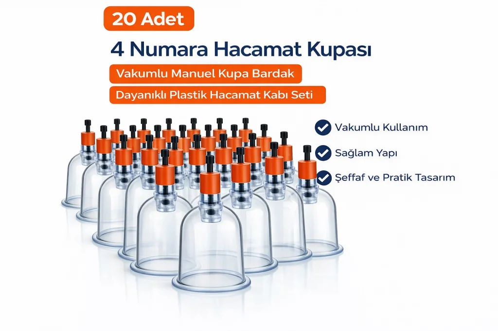 4 Numara Hacamat Kupası 20 Adet Vakumlu Manuel Kupa Bardak Dayanıklı Plastik Hacamat Kabı 4 Numara Hacamat Kupası 20 Adet set olarak gönderilmektedir. Manuel vakum sistemi ile kullanılan, dayanıklı plastik malzemeden üretilmiş hacamat kupa bardaklarıdır. Şeffaf tasarımı sayesinde uygulama sırasında bölge rahatlıkla gözlemlenebilir. 20’li ekonomik paket, yoğun kullanım için idealdir. Hem bireysel hem de profesyonel uygulamalara uygundur. Ürün Özellikleri: • 4 Numara hacamat kupası • 20 adet set • Manuel vakumlu kullanım • Dayanıklı sert plastik gövde • Şeffaf ve pratik tasarım • Kolay temizlenebilir yapı • Uzun ömürlü kullanım Ürün yalnızca kupa bardaklardan oluşmaktadır. Pompa dahil değildir (ürün içeriğine göre düzenleyebilirsin).