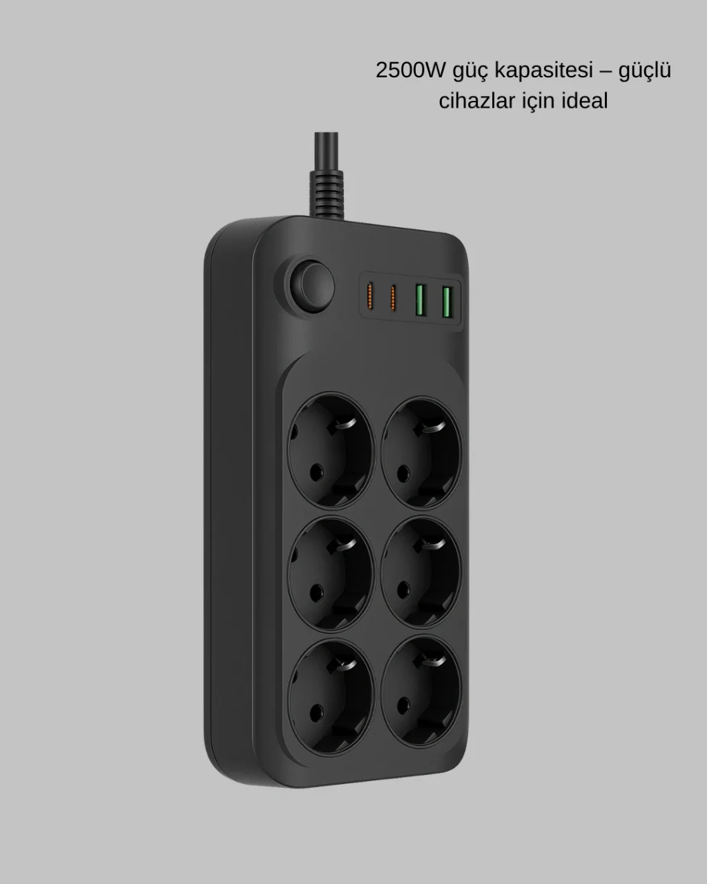 Termal akım korumalı 6 prizli multi uzatma kablosu, hem güvenlik hem de pratik kullanım sunan kompakt bir enerji çözümüdür. 2500W kapasitesiyle güçlü cihazlarla uyumludur. USB ve Type-C çıkışları sayesinde telefon ve tabletler en hızlı şekilde şarj edilebilir. Termal koruma ve 10A güvenlik ünitesi elektronik cihazlarınızı aşırı yüklenme ve dalgalanmalara karşı korur. 2 metrelik kablo uzunluğu kullanım esnekliği sağlar.Ürün Markası: Lisinya