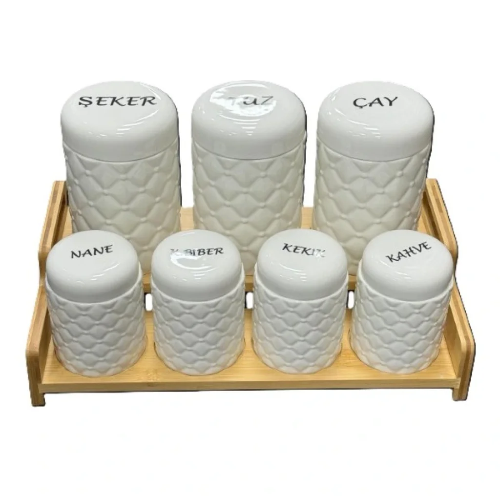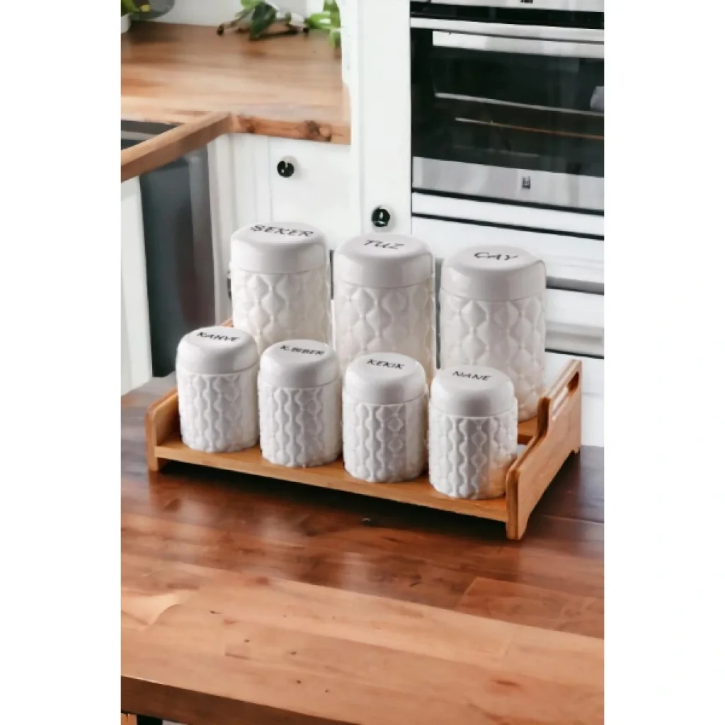 7'Lİ STANDLI BAHARAT SETİÜrün ÖzellikleriŞık ve fonksiyonel tasarımıyla 7'li Standlı Baharat Seti, mutfak düzeninizi tamamlayan zarif bir üründür. Beyaz seramik kapaklı baharatlıklar, modern ve minimalist bir görünüme sahiptir. Ahşap standı sayesinde düzenli kullanım sağlar ve mutfağınızda yer kaplamadan şık bir dokunuş ekler. Tuz, şeker, çay, kahve ve baharatları güvenle saklamak için idealdir. Kapakları sayesinde baharatlarınızı taze tutar ve hijyenik kullanım sunar.Paket İçeriği1 Adet Ahşap Stand7 Adet Seramik Kapaklı Baharatlık