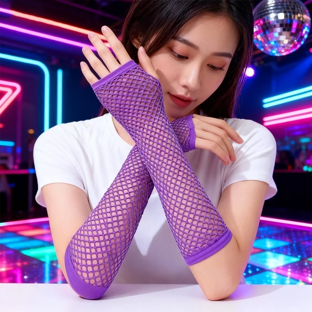 Retro ruhu yansıtan enerjik ve eğlenceli kombinler için 80&rsquoler 90&rsquolar retro mor file eldiven vazgeçilmez bir aksesuardır.