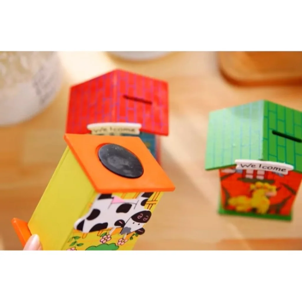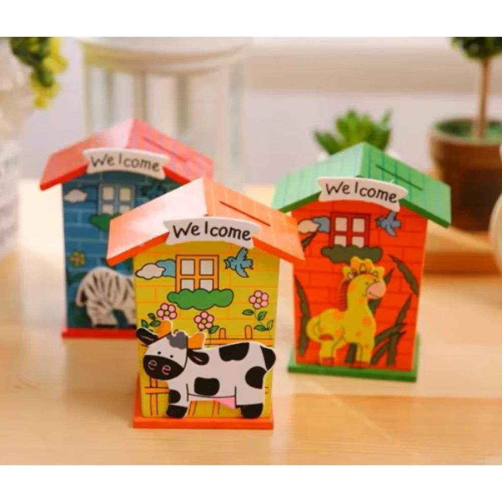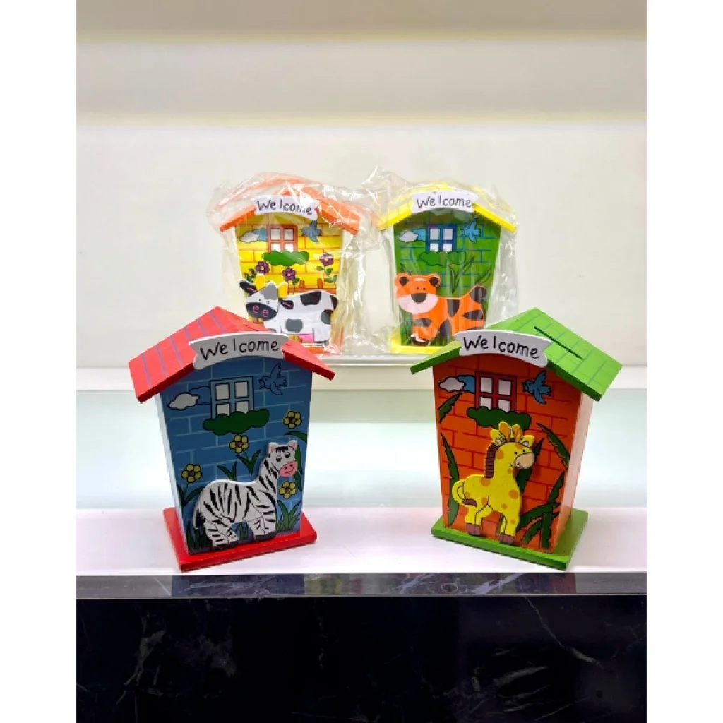 AHŞAP EV TASARIMLI KUMBARAÜrün ÖzellikleriÇocuklar için tasarlanmış hem dekoratif hem de fonksiyonel bir Ahşap Ev Tasarımlı Kumbara modelidir. Ahşap malzemeden üretilmiş olup dayanıklı bir yapıya sahiptir. Üzerinde yer alan renkli hayvan figürleri ve "Welcome" yazısı, çocukların ilgisini çekerken odalarına eğlenceli bir hava katar.Alt kısmında bulunan kapak sayesinde birikimler kolayca alınabilir ve yeniden kullanılabilir. Farklı renk ve desen seçenekleri ile her zevke hitap eder.Hem para biriktirme alışkanlığı kazandırmak hem de odada dekoratif bir obje olarak kullanılmak için ideal bir üründür. Hafif ve taşınabilir olması sayesinde istenilen her yerde rahatlıkla kullanılabilir.Eğitim materyali, hediye veya dekoratif amaçlarla tercih edilebilir.Çocukların finansal farkındalık geliştirmesine yardımcı olurken, odalarına şık bir görünüm kazandırır.Paket İçeriği1 adet Ahşap Ev Tasarımlı Kumbara